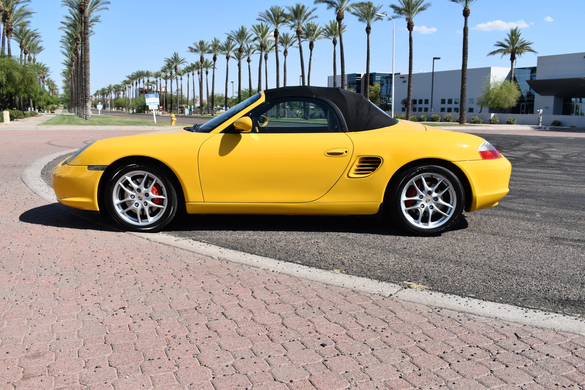 Factory 17″ wheels wear colored Porsche crest center caps and Sumitomo HTR ZII tires. Porsche Stability Management was equipped from the factory, and stopping power is provided by red-painted brake calipers with cross-drilled rotors at each corner.