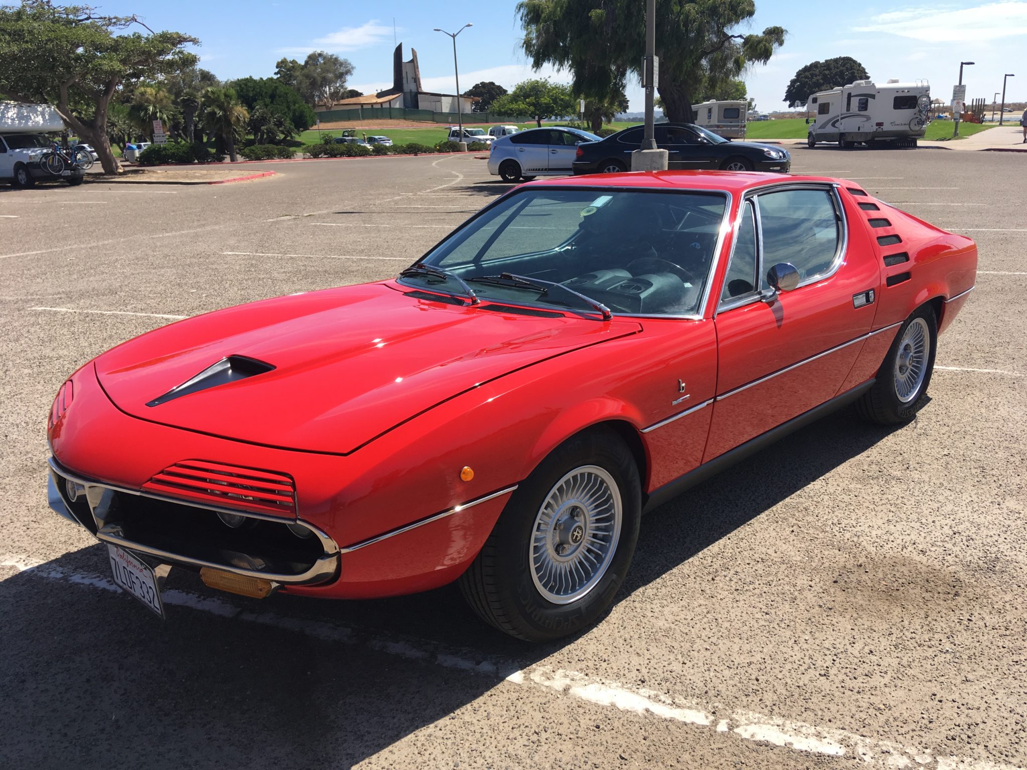 Turbine-style 14″ Campagnolo magnesium wheels have been media-blasted, repainted, and mounted with 195/70 Vredestein Sportrac S tires. Suspension features a double wishbone setup with coil springs up front and a live axle at the rear. The front end was overhauled and a Harvey Bailey Engineering handling kit fitted under current ownership, the latter of which lowers the ride height approximately an inch. The braking system was serviced with a new master cylinder, Goodrich hoses and fittings, and rear pads.