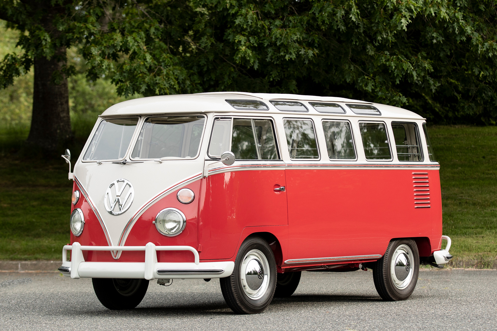White 15″ steel “wide five” wheels wear chrome VW hubcaps and 6.40-15″ Firestone Deluxe Champion tubeless tires. The steering box side plate was resealed in 2016.