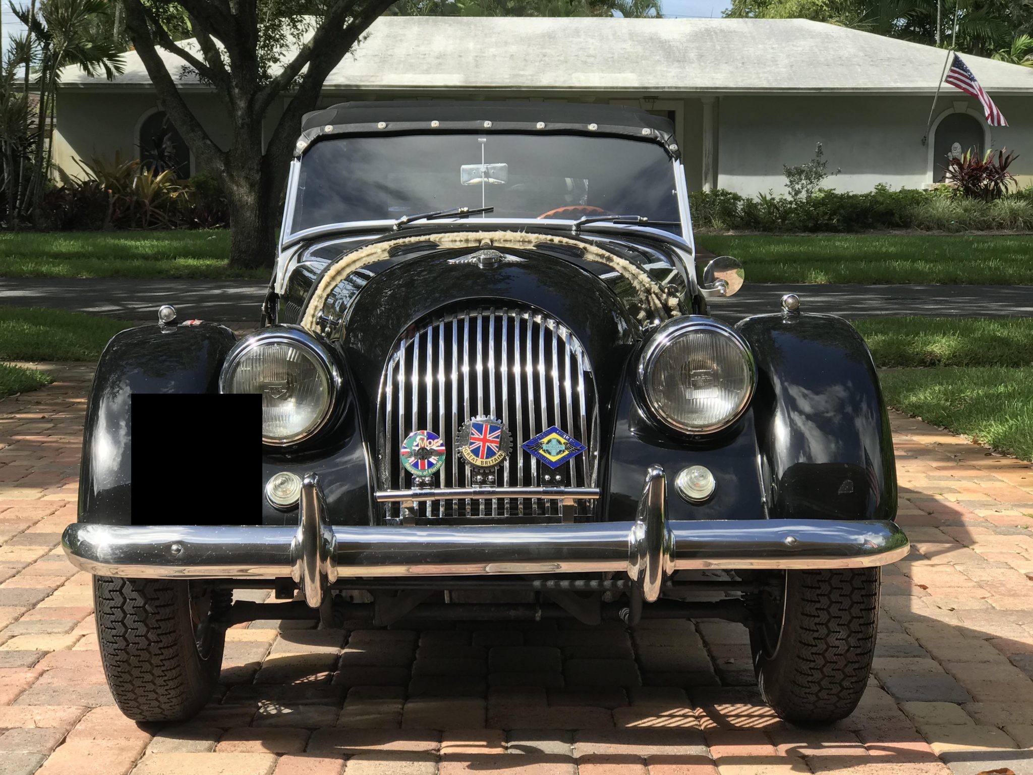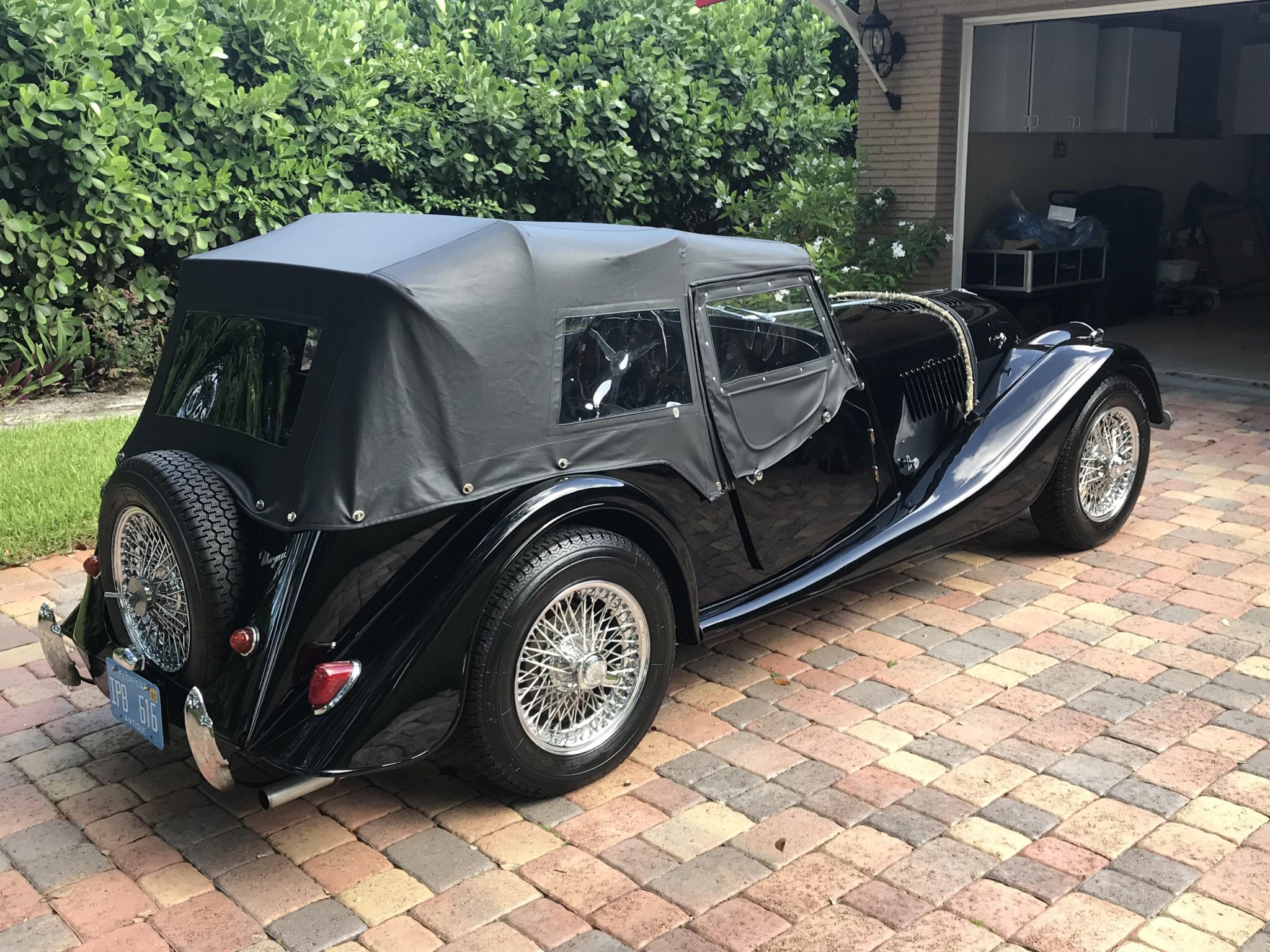 The new soft top and removable side curtains are pictured mounted and stowed. Replacement chrome knock-off wire wheels wear 165SR-15 Michelin XZX radial tires with 2010 date codes, and a spare is mounted to the rear. The braking system was overhauled with new front discs and pads, rear shoes, and hoses during the earlier work, and was converted to use a dual-circuit master cylinder with rerouted lines in 2019.