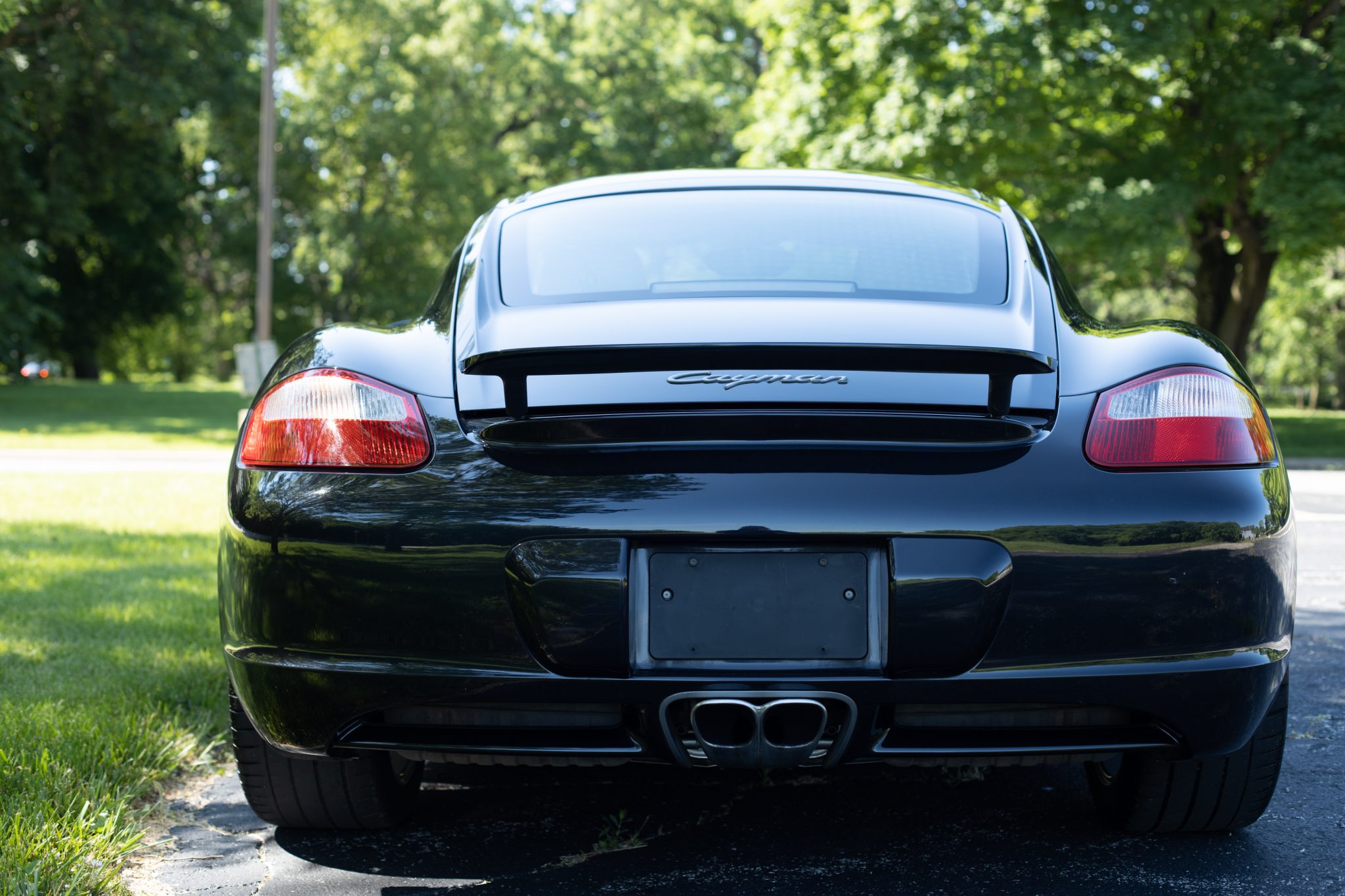 Optional 18″ Cayman S wheels wear colored Porsche crest center caps and Michelin Pilot Sport 4s tires that show date codes from 2018. Scratches are visible on the edges of the wheels.
