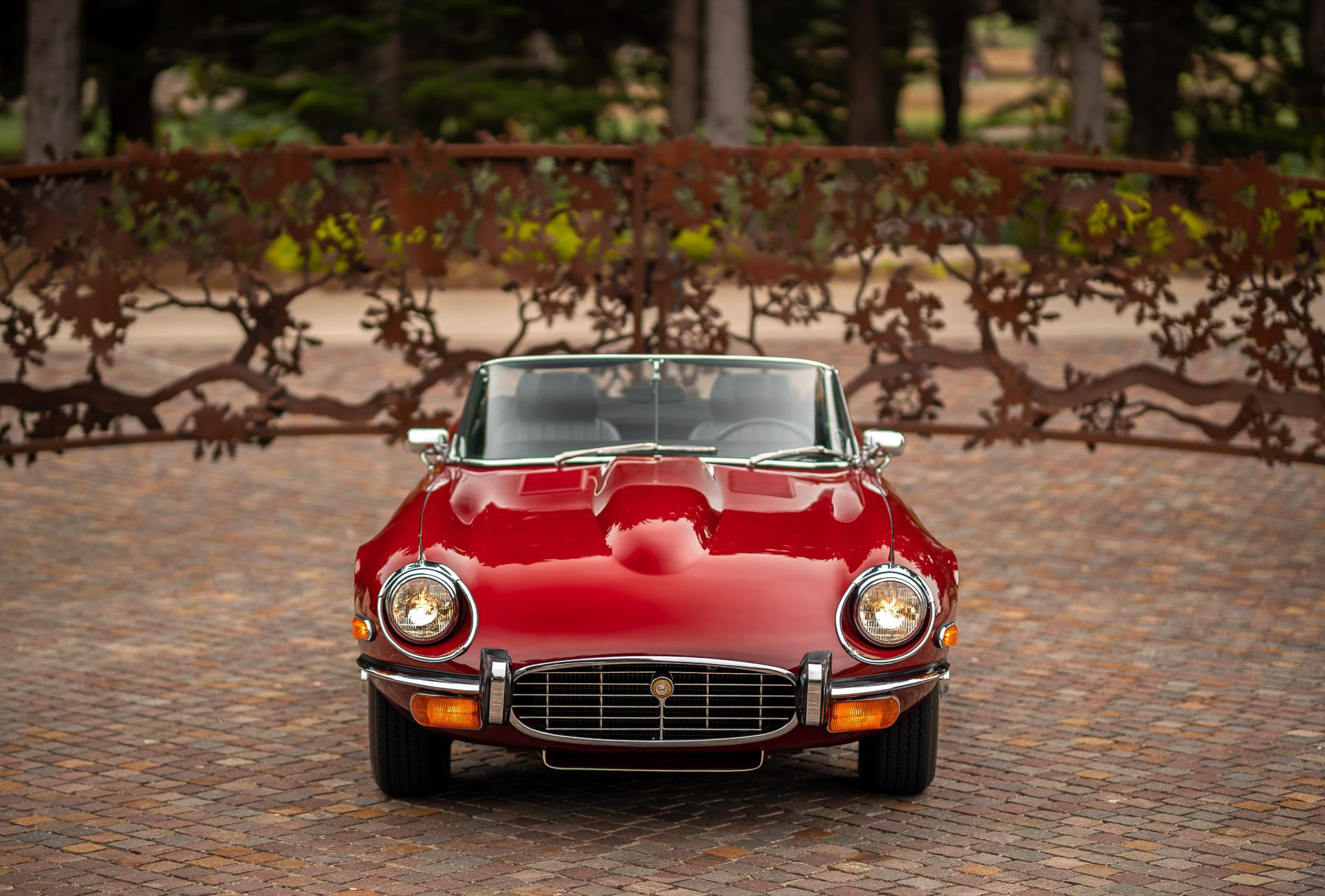 Chrome-finished 15″ wire wheels are mounted with Jaguar knockoffs and wear Pirelli P400 whitewall tires. The suspension was rebuilt in the 1990s.