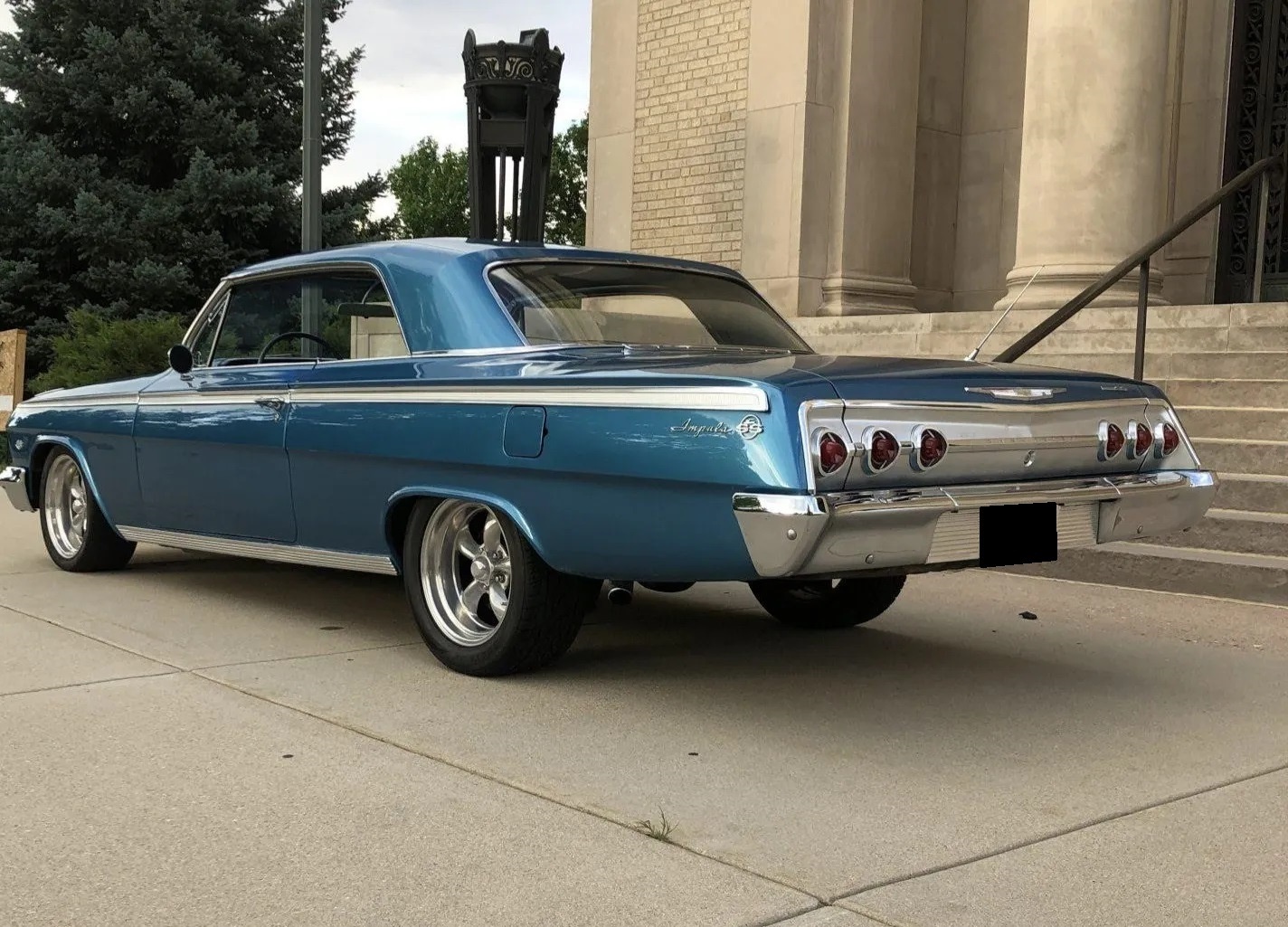 The car rides lower than stock over polished 17″ American Racing Torq Thrust II wheels wearing Kumho tires. The front drum brakes were replaced by power-assisted calipers and discs during current ownership. An aftermarket power steering system installed by the seller is based around a Chevrolet 500-series steering box.
