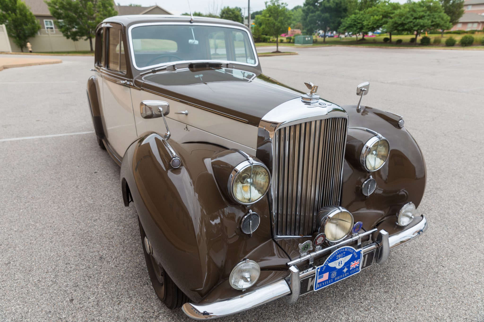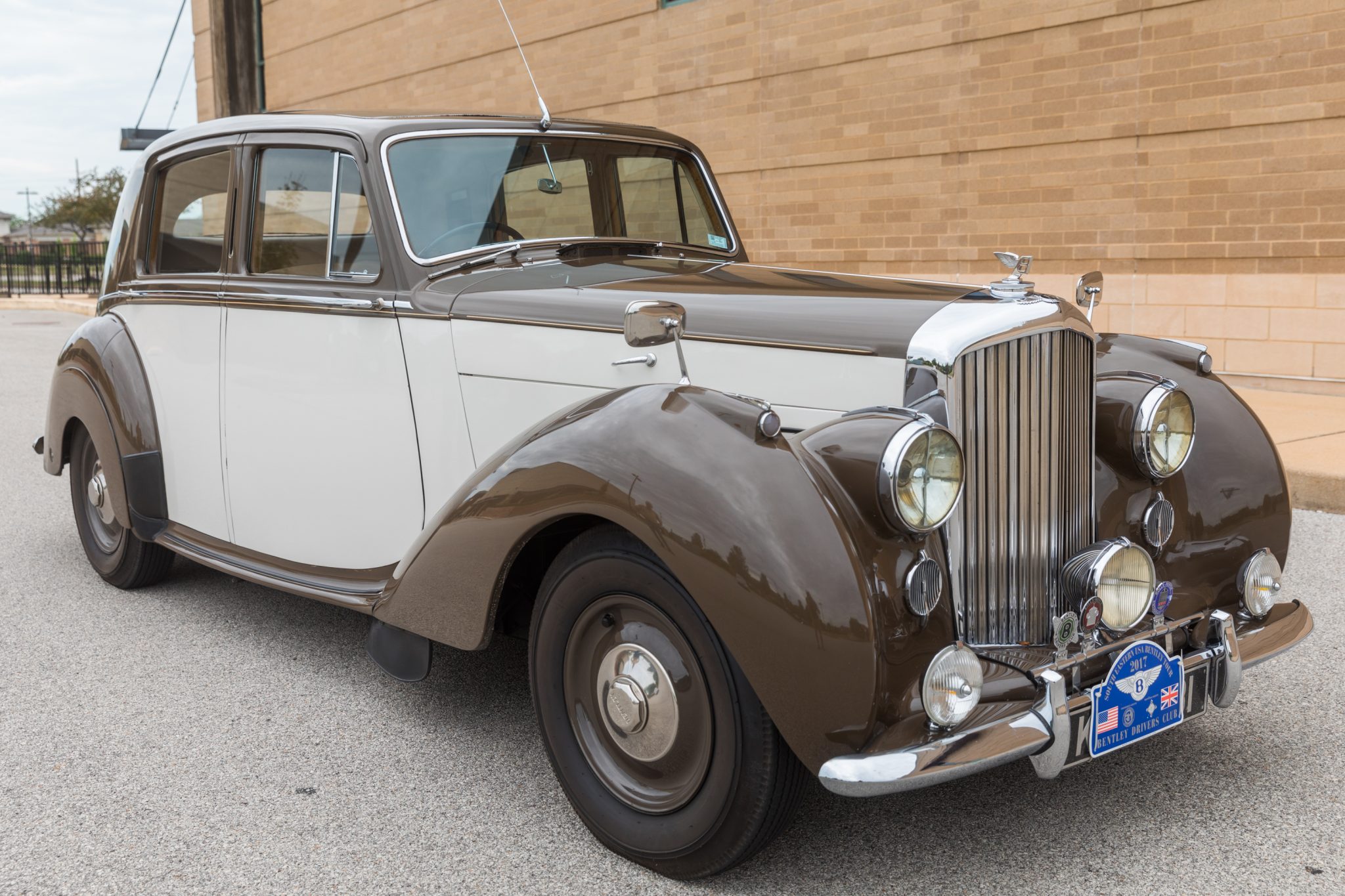 Exterior details include semaphore turn signals concealed in the B-pillars, a roof-mounted antenna, dual fender mirrors, rear wheel skirts, and a badge bar that holds a center-mounted driving light and several Bentley club emblems ahead of the grille. Body-colored steel wheels wear Bentley hubcaps as well as BFGoodrich Silvertown tires and inner tubes that were installed under current ownership.
