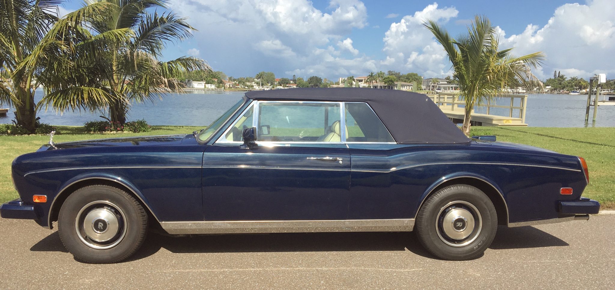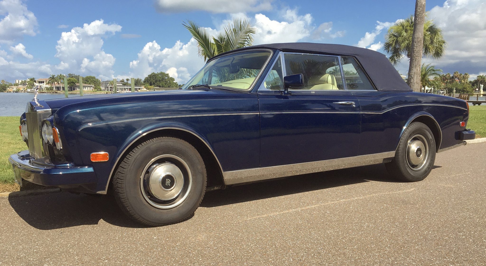 The dark blue mohair motorized top is shown both raised and stowed beneath a fitted boot. Factory 15″ steel wheels wear chrome hubcaps with colored center caps and are wrapped with Ironman tires in the front and Goodyear Eagle RS-A tires at the rear.