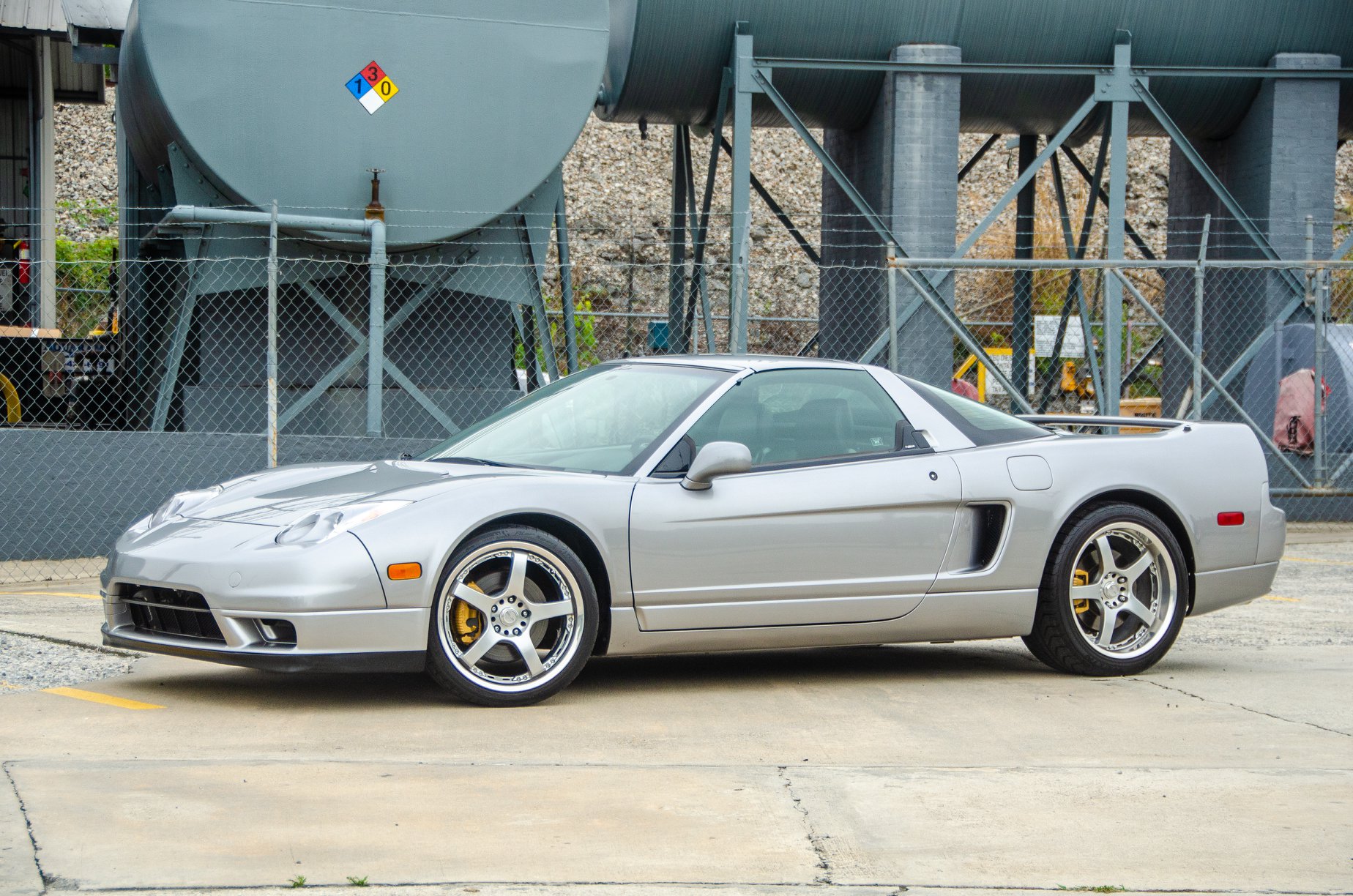 Silver Ro-Ja R2-5 wheels measure 18″ in diameter at all four corners and are mounted with mismatched Michelin tires. Braking is handled by yellow NSX calipers on vented steel rotors front and rear.