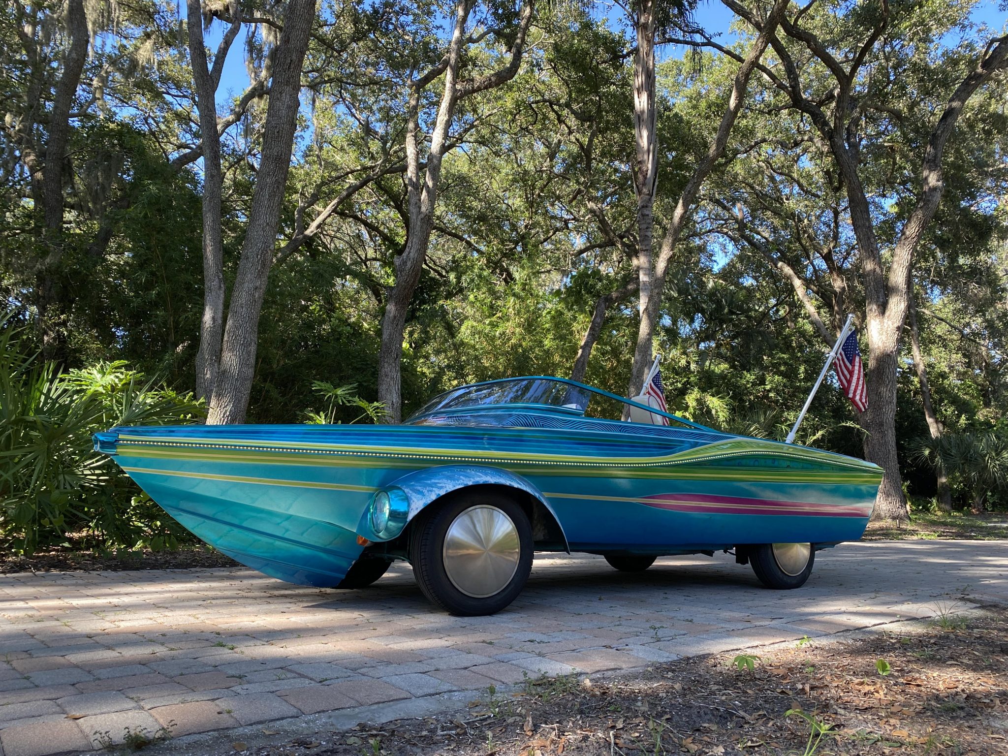 Steel 15″ wheels are fitted with disc-style wheel covers and are mounted with Yokohama Avid Ascend tires. The vehicle retains factory Beetle suspension with transverse front torsion bars and rear trailing arms. A set of air shocks are fitted at the rear, though the seller notes that the suspension will bottom out under high loads. Wear in the trailing edges of the hull is visible where it has impacted the ground.