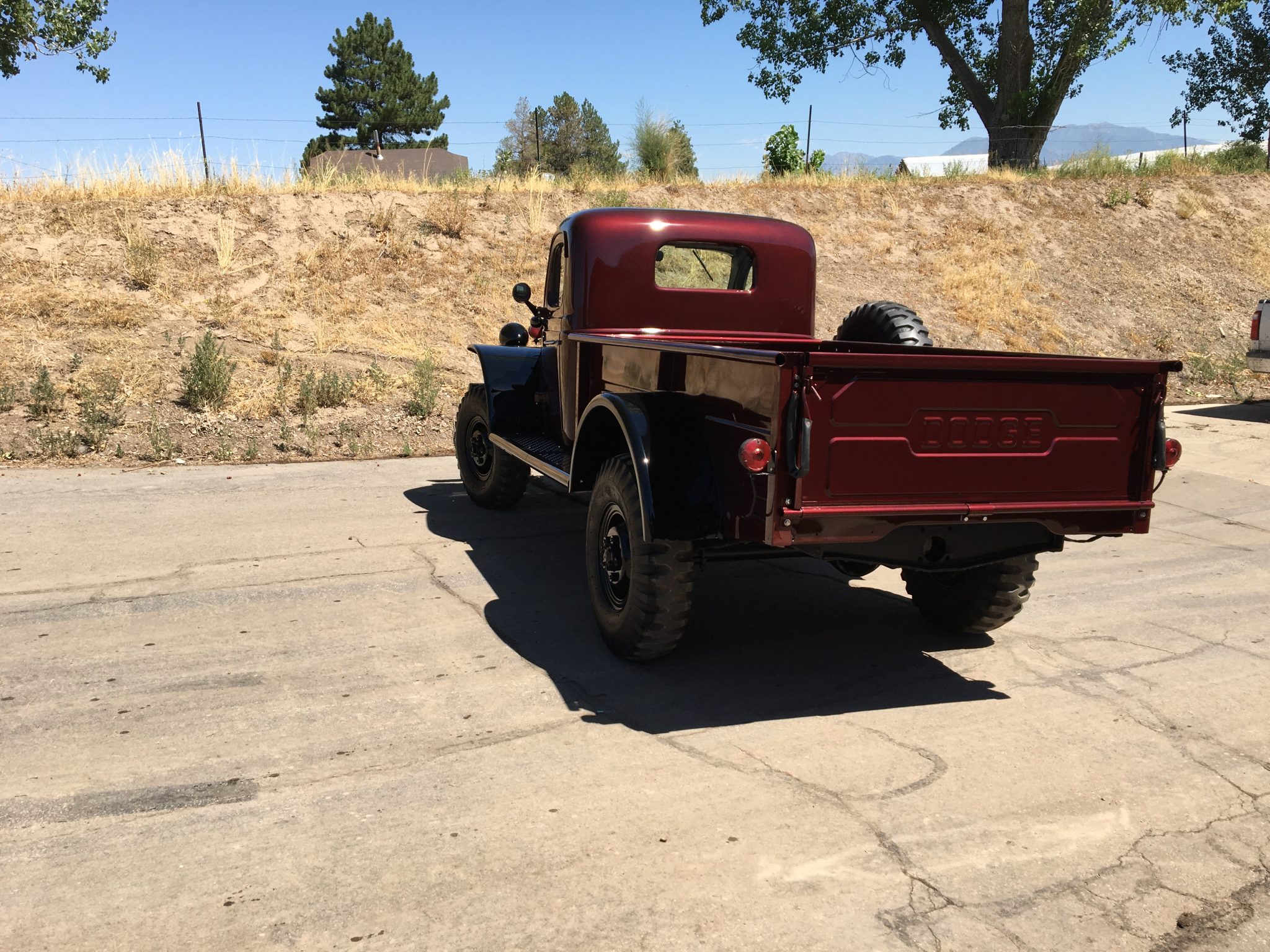 Black-finished 16″ steel wheels wear replacement Firestone Military tires, and a full-sized spare wheel and tire are mounted on the right side of the bed. The seller states that the axles and brakes were overhauled during the refurbishment.
