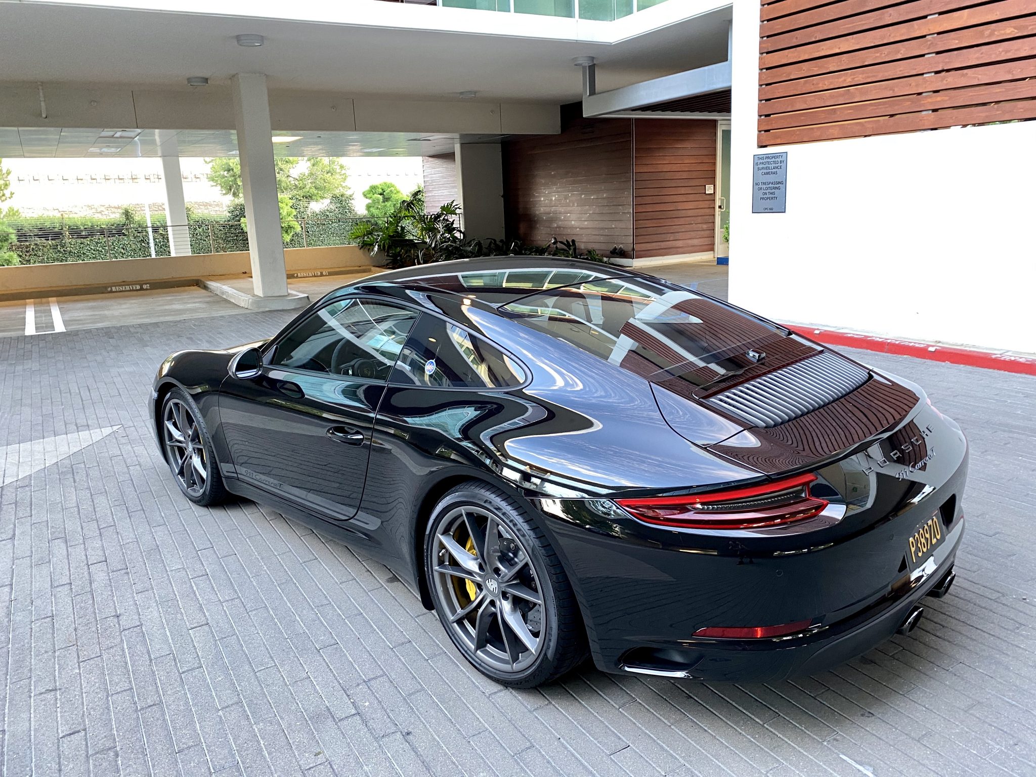 Factory 20″ wheels are wrapped in Pirelli P Zero tires. The Carrera T features adjustable suspension modes via Porsche Active Suspension Management (PASM), Torque Vectoring (PTV), and a shorter final drive at 3.59:1. Porsche Ceramic Composite Brakes (PCCB) were optioned and are highlighted by yellow-finished calipers.