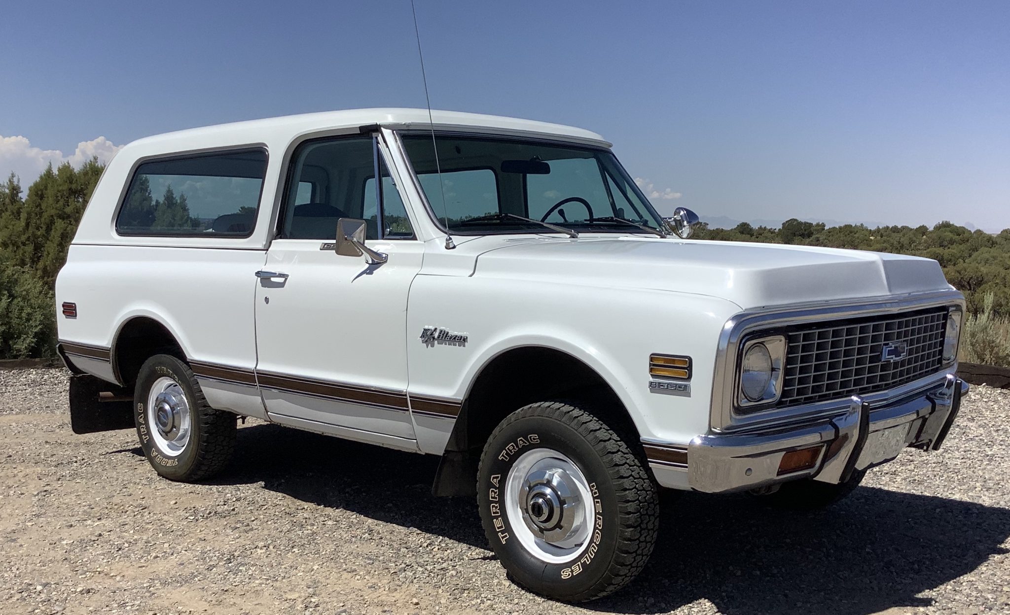 White-finished 15″ factory steel wheels wear chrome hubcaps and 235/75 Hercules Terra Trac tires. The truck is equipped with a tow-hitch receiver, locking front hubs, and large rear mud flaps.