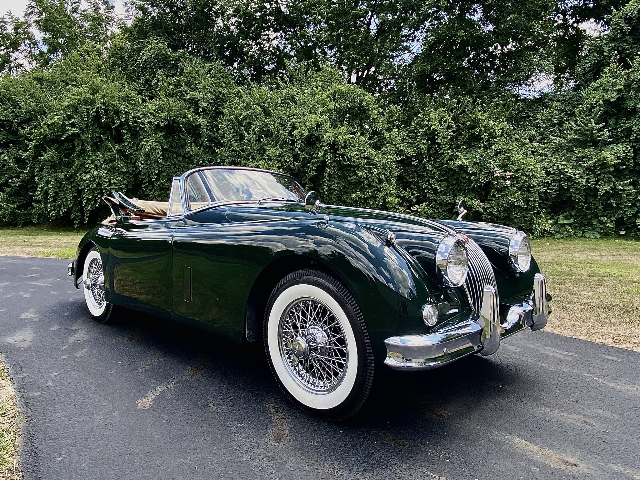 Chrome-finished 16″ wire wheels wear two-ear Jaguar knockoffs and were reportedly mounted with new Auburn Diamondback whitewall tires in September 2019.