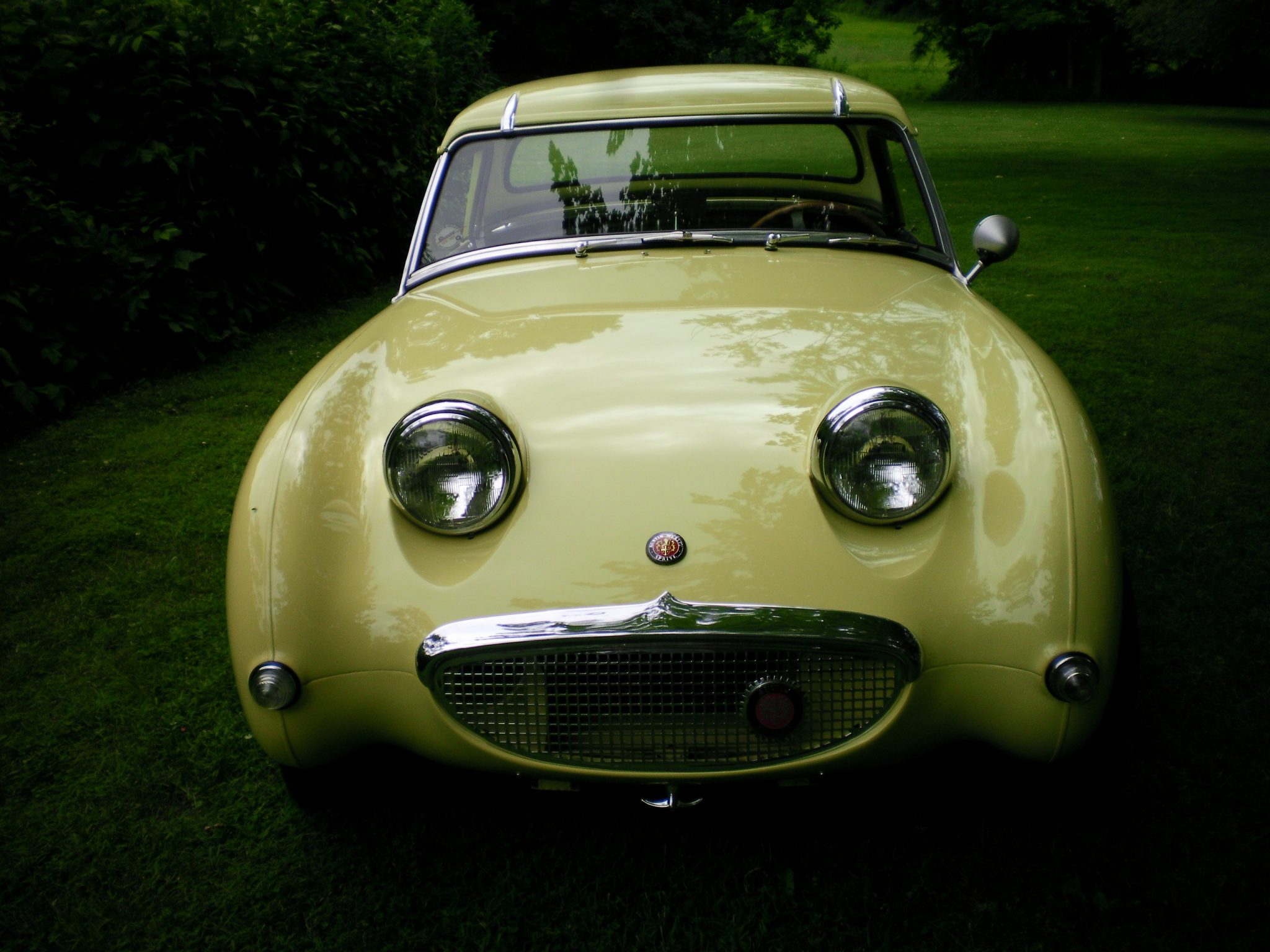 Silver 13×5″ Panasport wheels with Austin-Healey center caps are wrapped in 165/70 Dunlop SP20 FE tires. Factory steel wheels with AH chrome hubcaps and Dunlop Gold Seal tires are included in the sale and pictured in the gallery. Owner modifications include a front disc-brake conversion and an added sway bar.