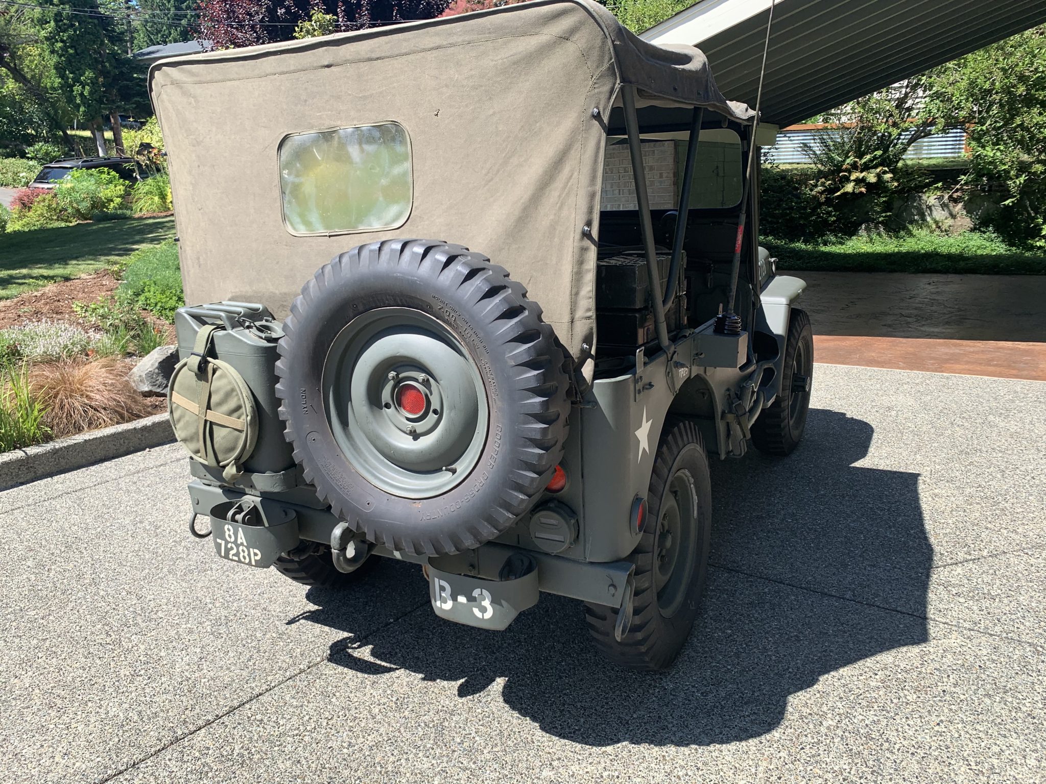 Color-matched 16″ steel wheels wear military-style Cooper Cross-Country tires and feature manually-locking front hubs. The brake system was reportedly serviced approximately 150 miles ago with replacement pads, shoes, and wheel cylinders. A full-size spare is affixed to the rear bodywork, along with a supplementary fuel can.