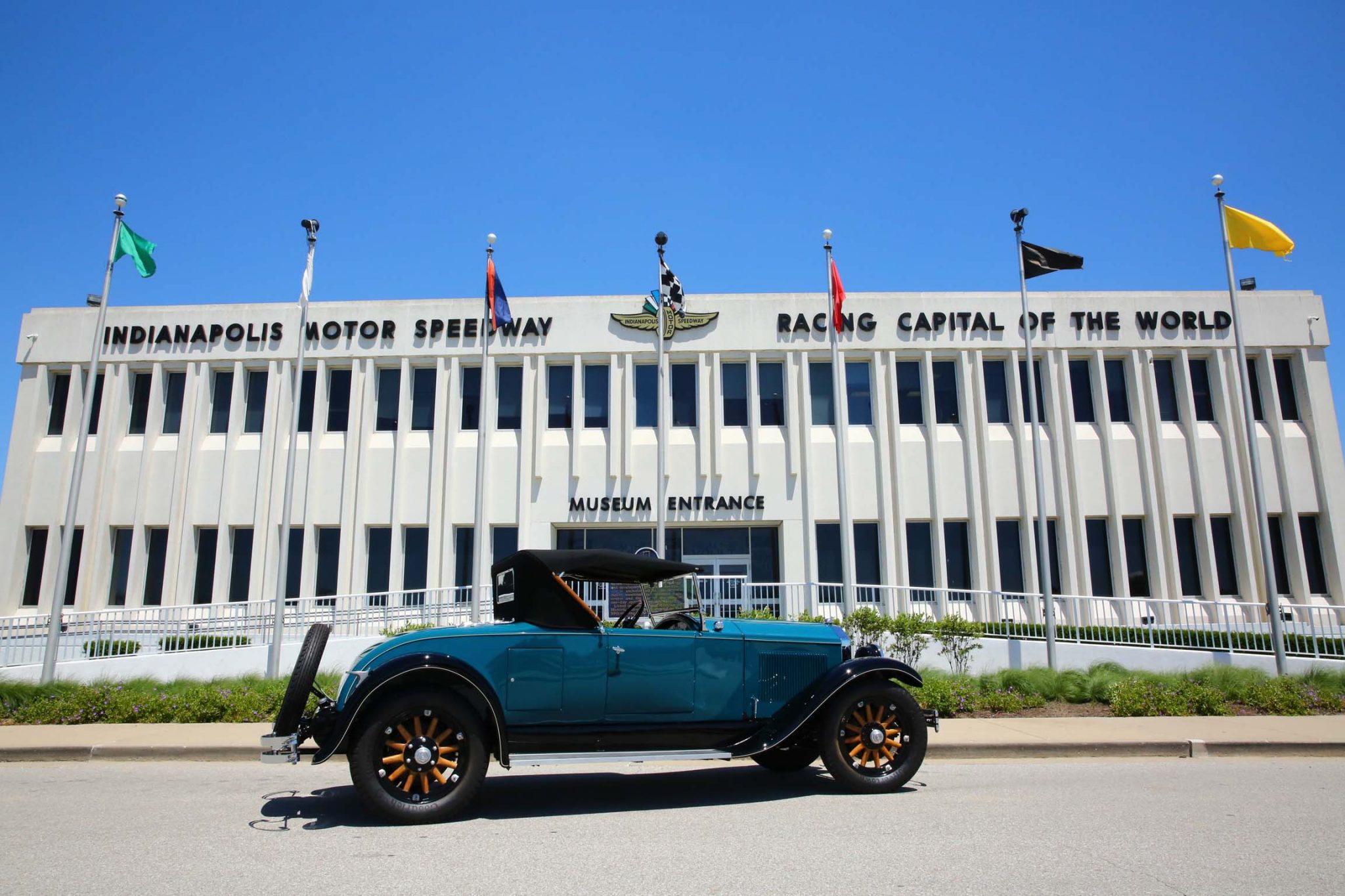 The black soft top features a wood frame and glass rear window. The 21″ wood-spoke wheels are mounted with Goodrich Silvertown six-ply tires, and a spare wheel rim with a matching tire is mounted out back. Braking is handled by mechanical drums at all four corners.