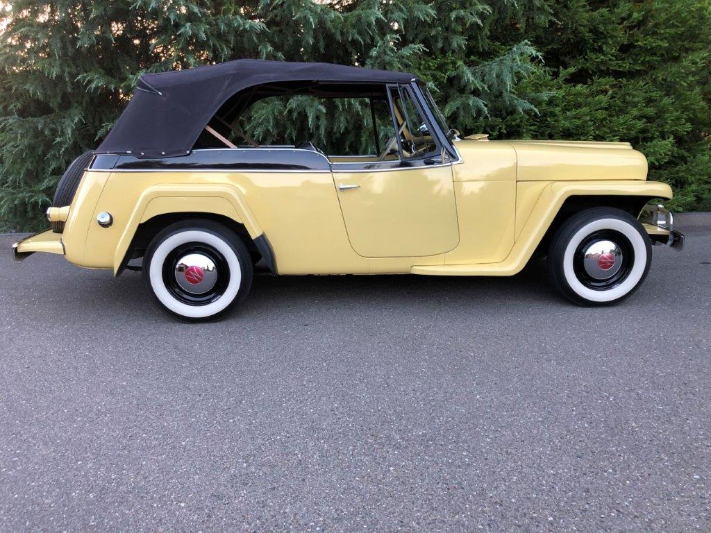 Black steel wheels wear chrome hubcaps with red Willys insignias, beauty rings, and wide-whitewall tires. The seller notes the tires may be over 30 years old, and a matching spare is mounted to the rear. The brakes were adjusted as part of the seller’s work in 2019.