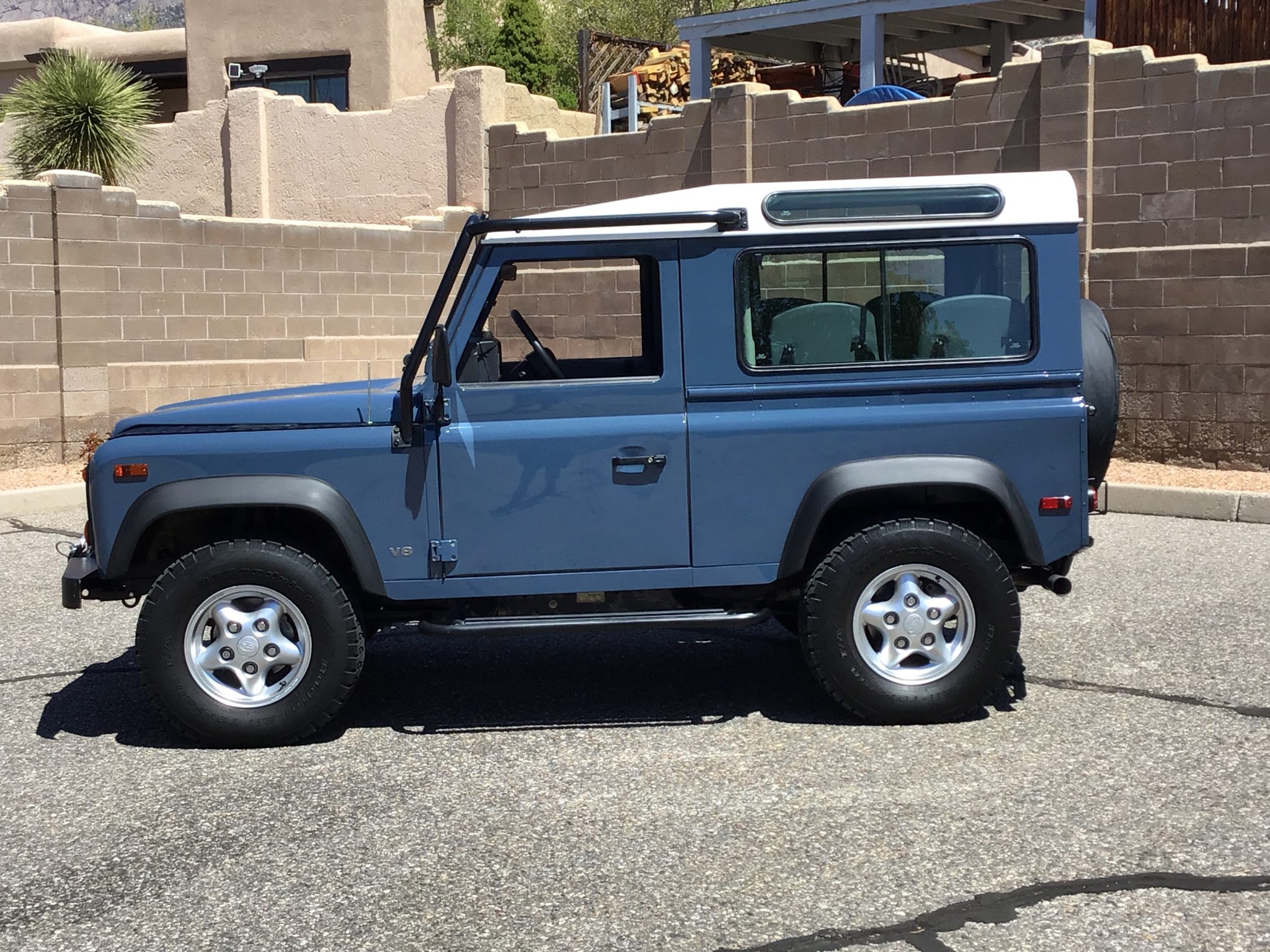 Factory Freestyle 16″ alloy wheels wear 265/75 BFGoodrich Radial All-Terrain T/A tires. A spare with a Land Rover-branded cover is mounted to the side-hinged rear door.