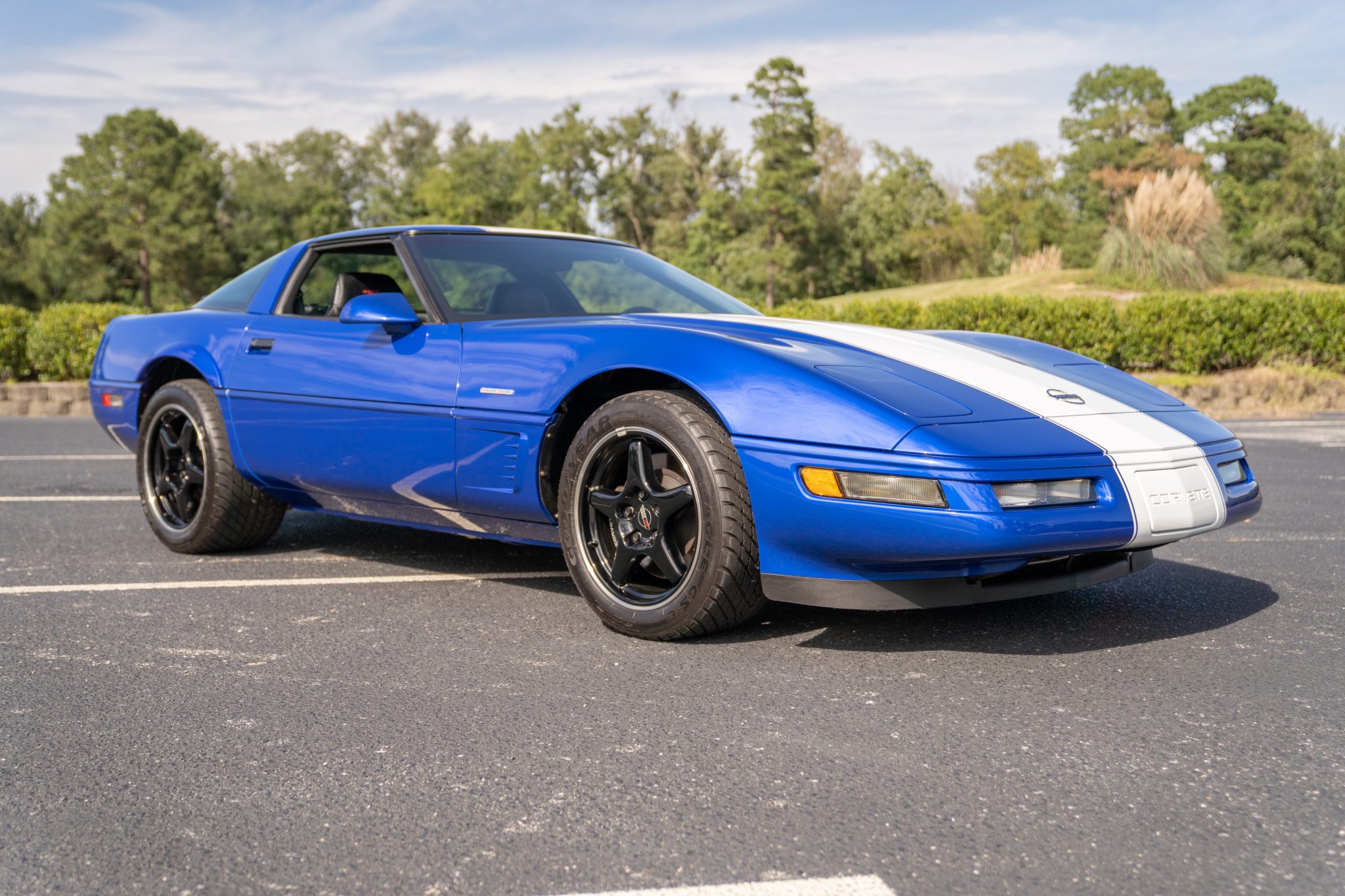 Factory 17″ wheels are finished in black and mounted with 275/40 and 315/35 Goodyear Eagle GS-C tires. Four-wheel disc brakes are equipped, and the four-piston front calipers are finished in black with white Corvette lettering.