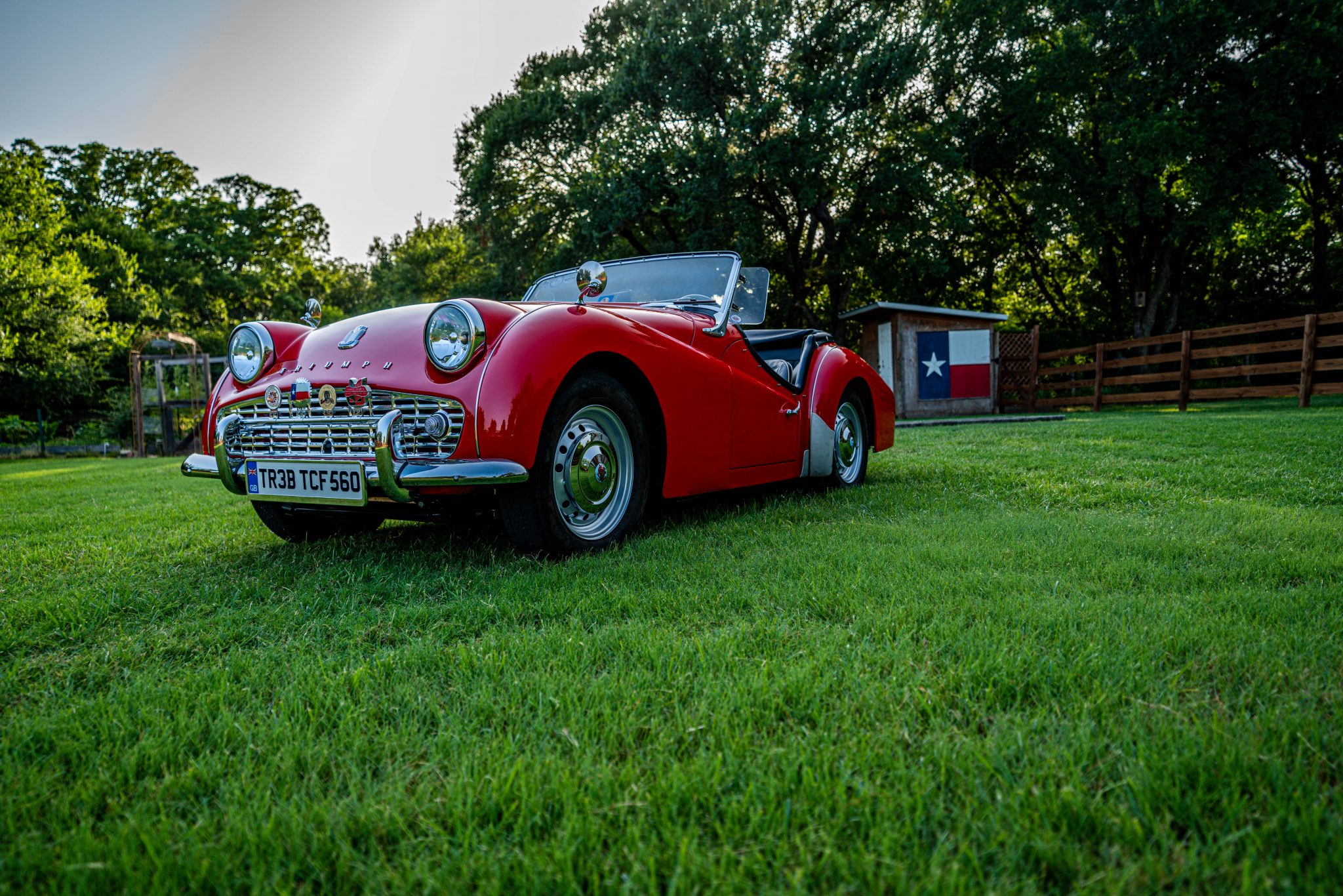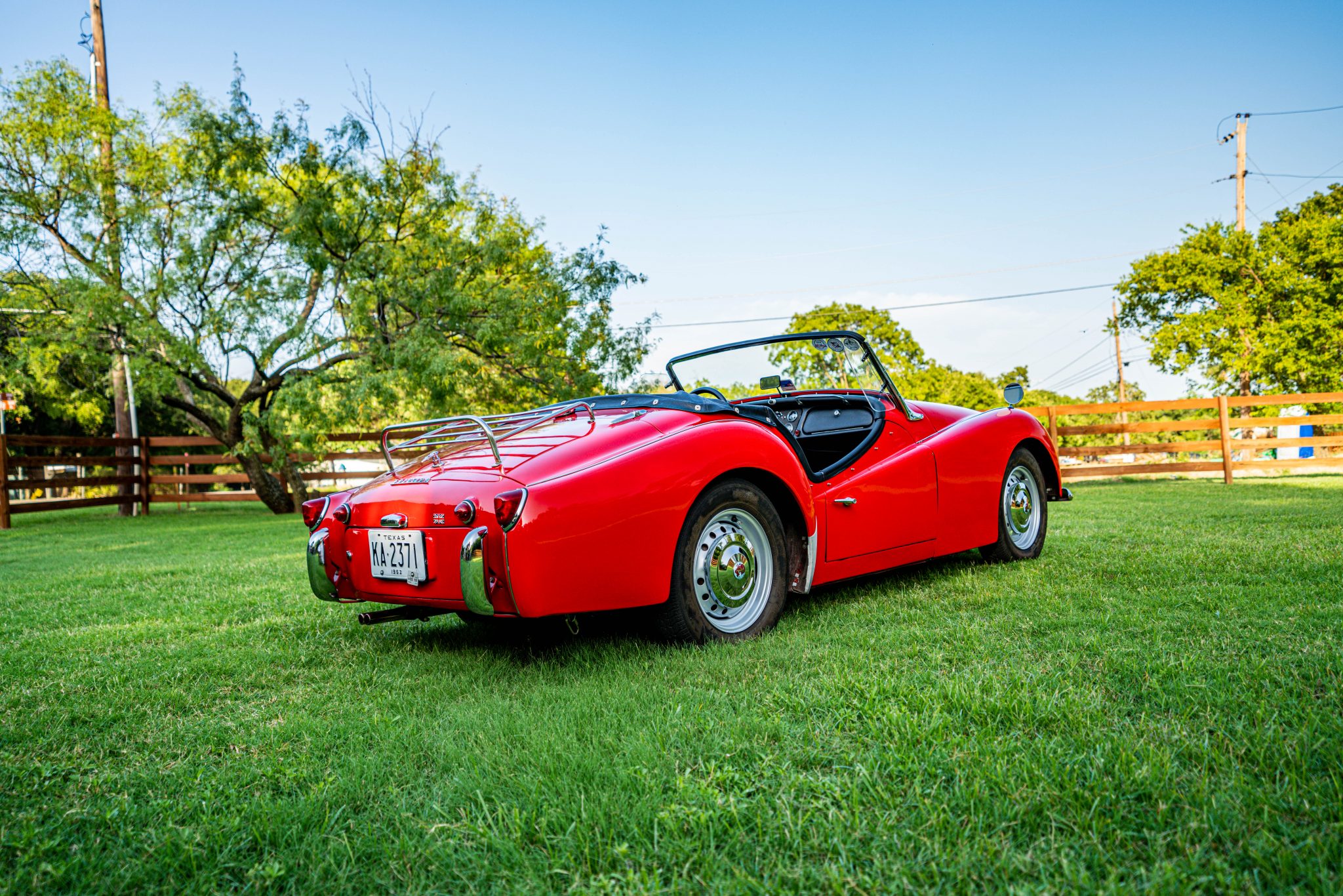 Powdercoated 15″ steel wheels with chrome hubcaps and trim rings are wrapped in 165-series radial tires. The suspension has been modified with rebuilt rear shocks, rack-and-pinion steering sourced from a Triumph Spitfire, and an added anti-sway bar. Front brake calipers have been replaced, and braided steel brake lines have been installed by the seller.