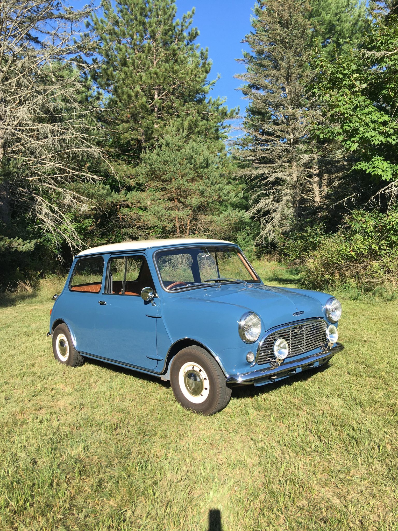 Cream 10″ alloy wheels feature polished center caps and wear 165/70 Yokohama Advan HF Type-D A008 tires showing 2017 date codes. The seller states that Cooper S front discs and rear drums were installed during previous ownership and that suspension upgrades since 2017 include GAZ adjustable dampers, front and rear coil springs with Hi-Los, adjustable diagonal tie rods, and polyurethane bushings. Service since 2017 is said to include replacing the tie rod ends, ball joints, bump stops, rear brake shoes, and wheel cylinders.
