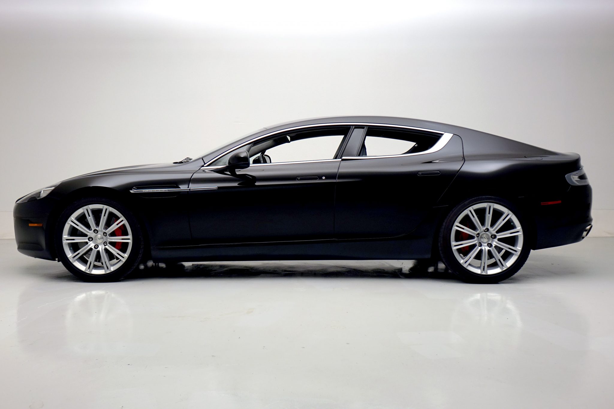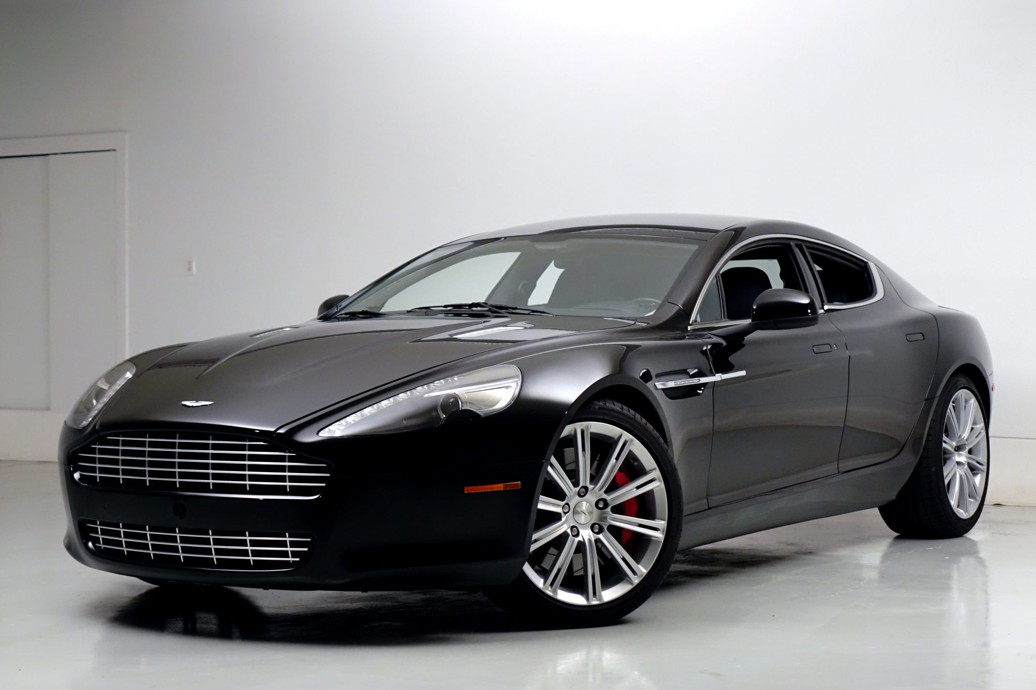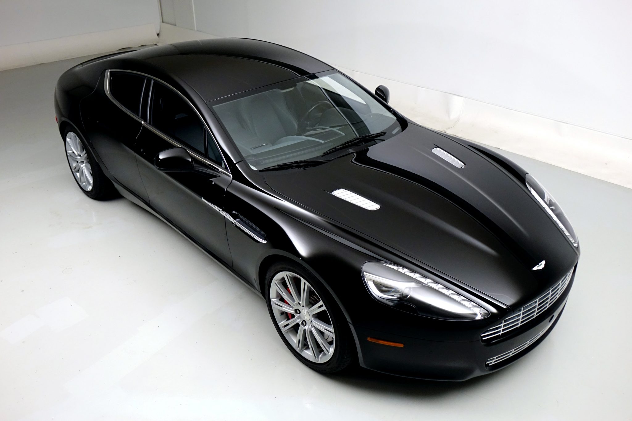 Factory 20″ ten-spoke wheels are mounted with Bridgestone Potenza tires that show 2016 and 2018 date codes. Red-finished brake calipers and slotted rotors are fitted at each corner, and standard equipment on the Rapide includes an adaptive suspension system.