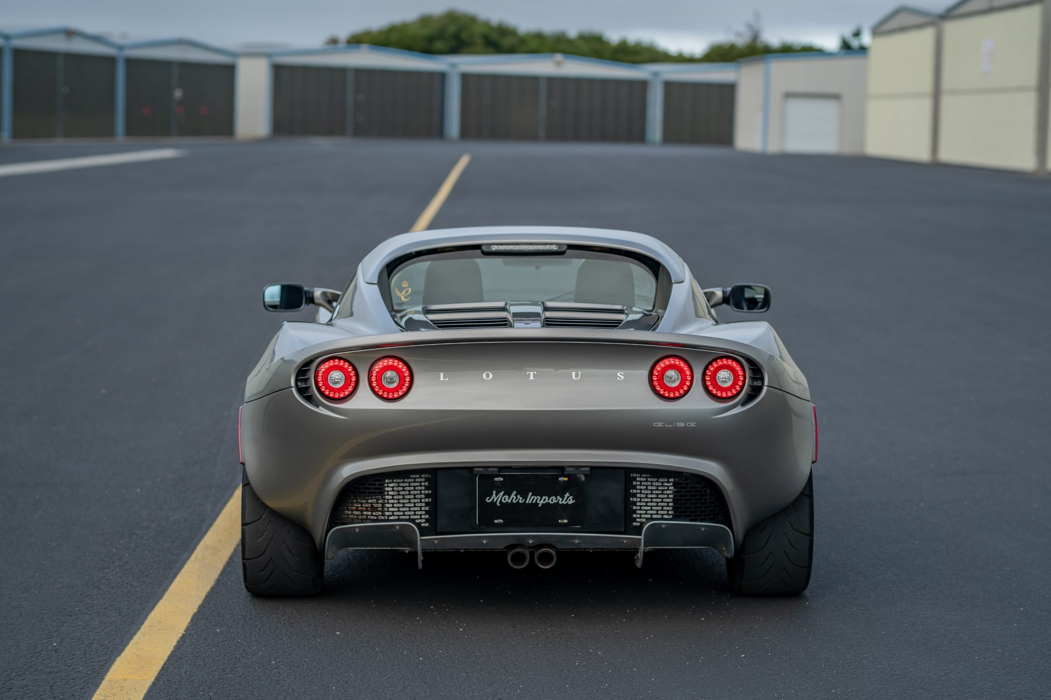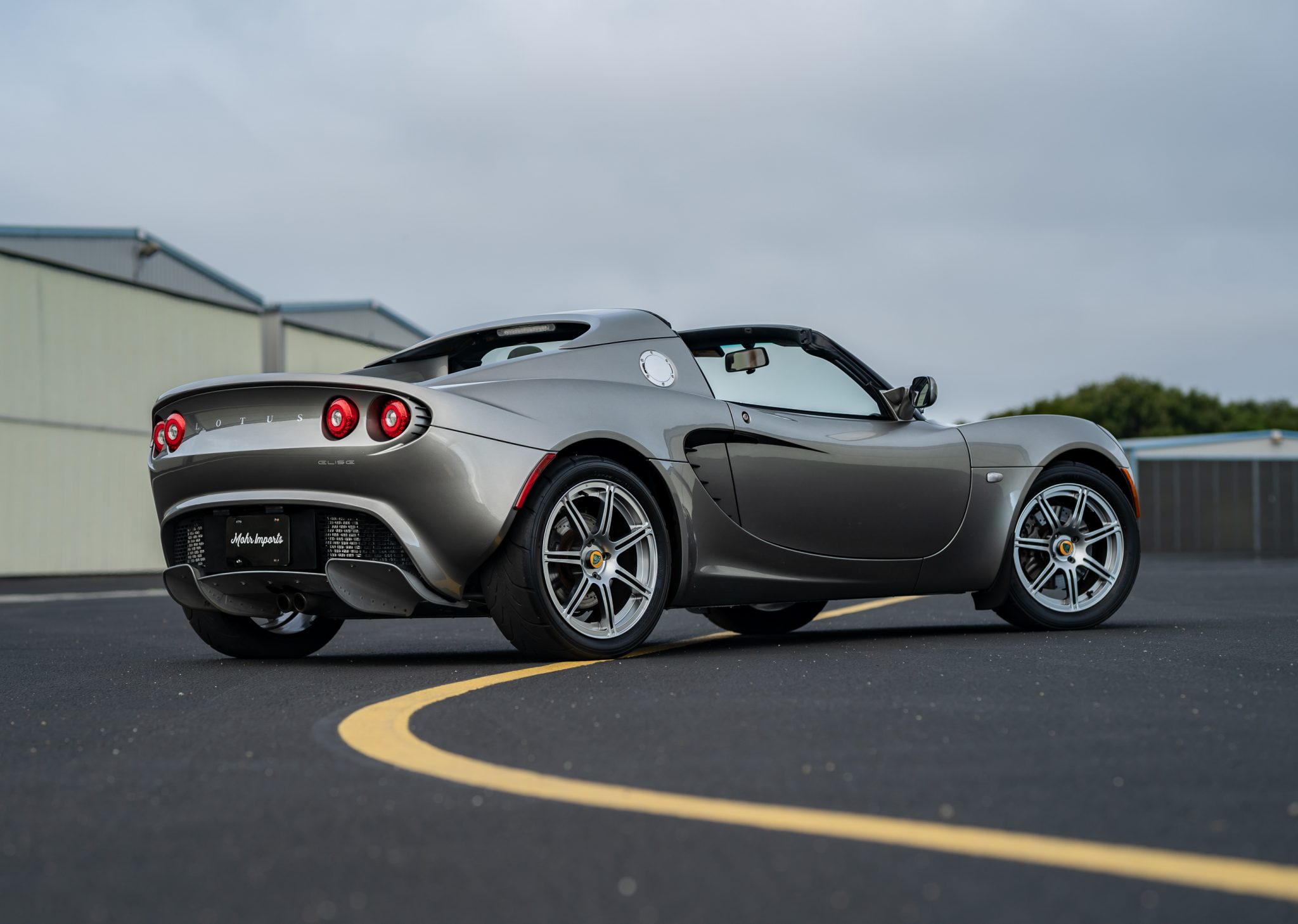 Staggered-diameter wheels feature Lotus center caps and wear 195/50R16 front and 225/45R17 rear Yokohama Advan A048 tires. Braking is from cross-drilled rotors all around and Lotus-branded AP Racing calipers up front. The removable soft-top is depicted above.