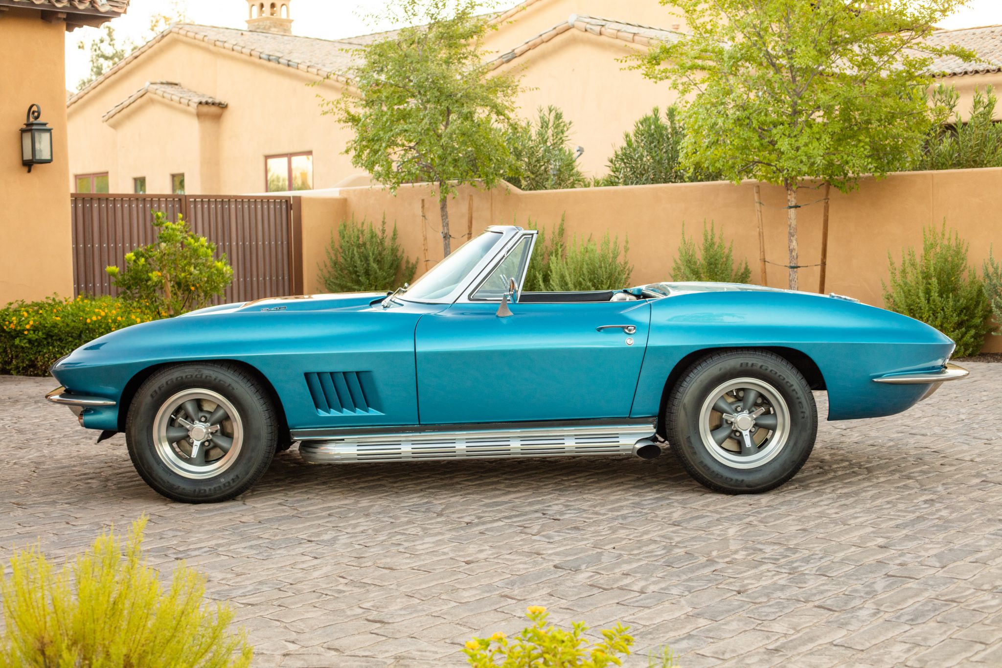 Torq Thrust–style 15″ wheels wear simulated three-ear knockoffs and are mounted with 205/70 BFGoodrich Radial T/A tires. Braking is carried out by four-wheel discs that are said to have been upgraded using stainless-steel sleeved calipers and fitted with replacement Delco rotors, rubber brake hoses, and a master cylinder during the seller’s ownership. Suspension modifications include QA1 rear shocks, a Vette Brakes & Products 330-pound rear spring, and adjustable strut rods.