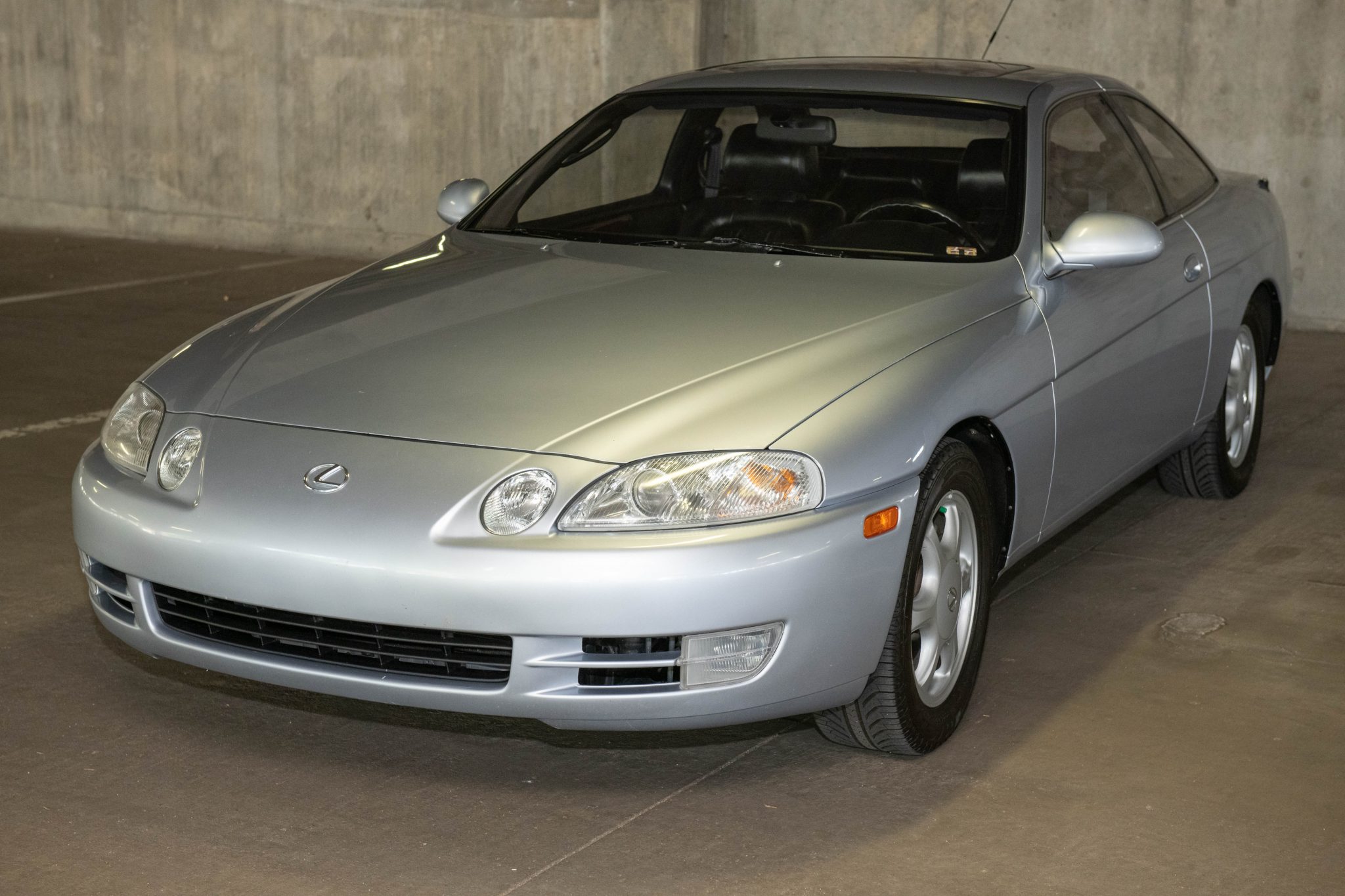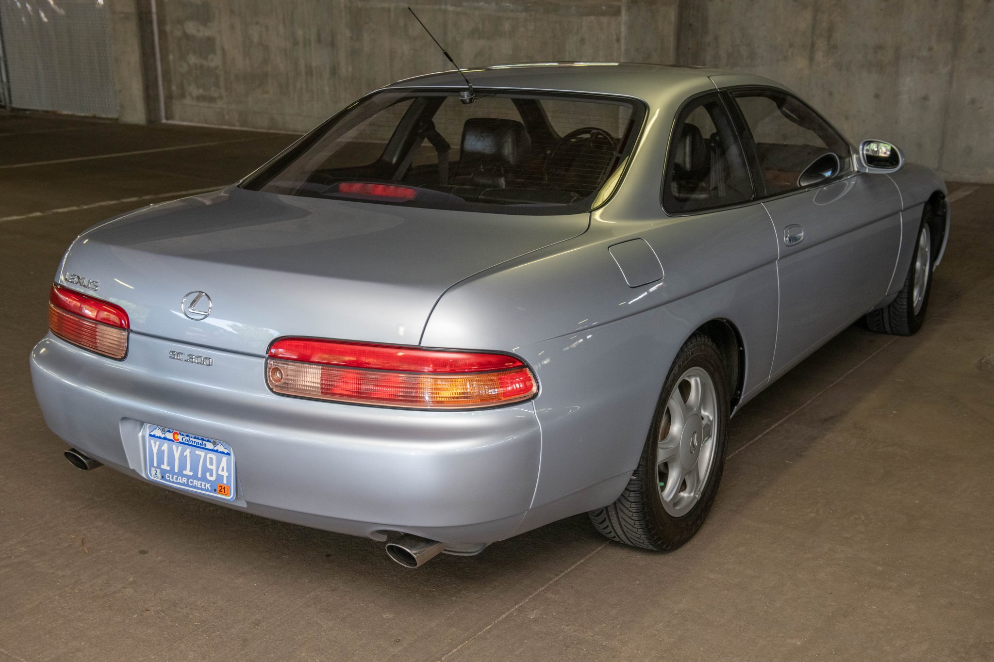 Factory 16″ six-spoke alloy wheels wear 225/55 Michelin Pilot Sport A/S tires, and a steel wheel with a full-sized spare tire is stored in the trunk. Equipment includes four-wheel independent suspension, front and rear stabilizer bars, four-wheel disc brakes, and speed-sensitive power steering. The seller reports that the rear struts show signs of fluid seepage, and curb marks are visible on the wheels.