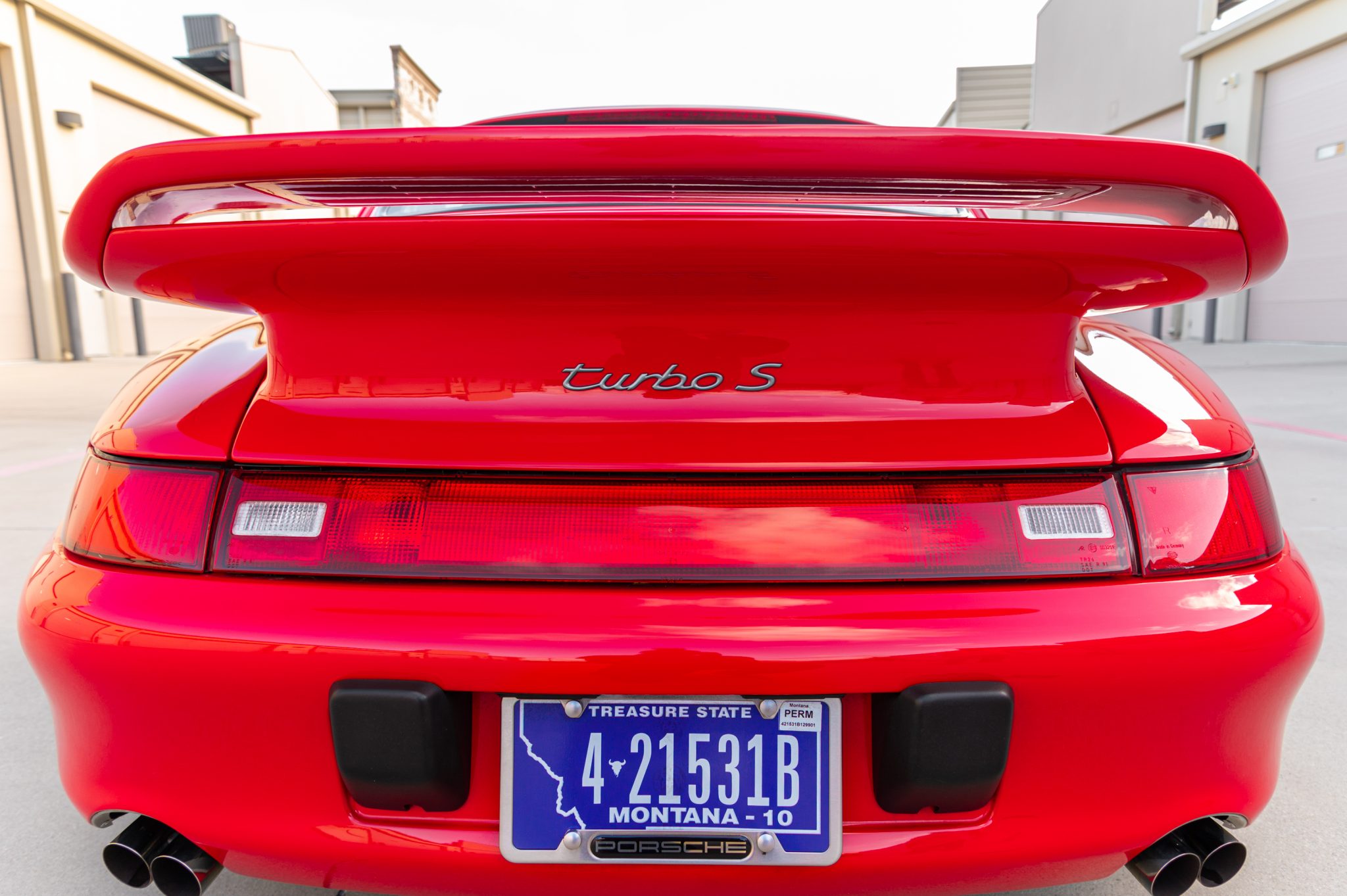 Factory 18″ cast alloy wheels wear a satin finish and are mounted with Pirelli P Zero Rosso tires sized 225/40 up front and 285/30 out back. The center caps feature machined Turbo S script, and each corner is pictured individually in the gallery. Braking is managed by ventilated and cross-drilled rotors paired with yellow four-piston calipers all around.