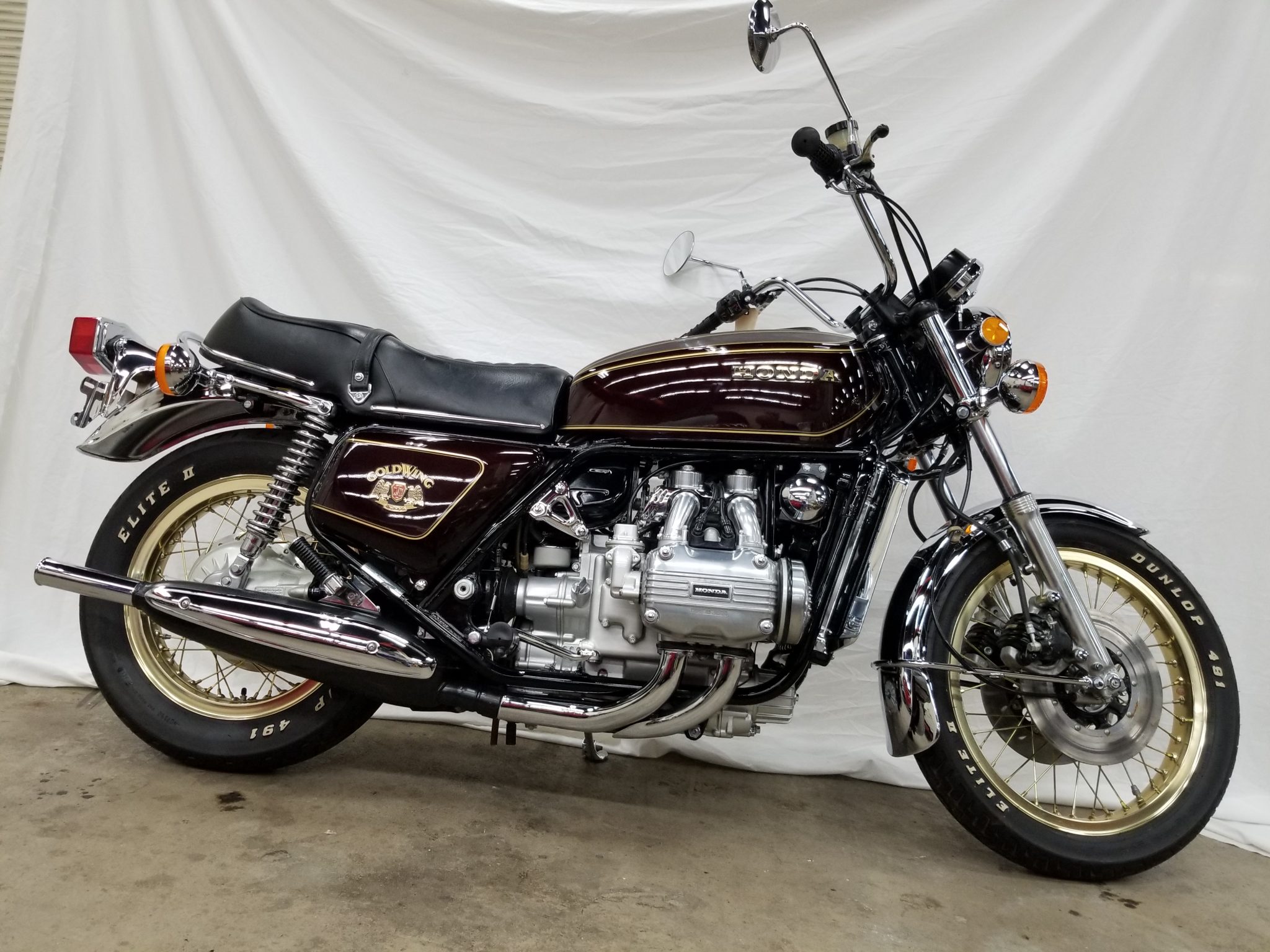Wire wheels with gold shouldered rims and spokes wear older Dunlop Elite II tires. Suspension consists of a conventional fork and a swingarm mounted with dual shocks. Braking is from dual discs up front and a single version in the rear.