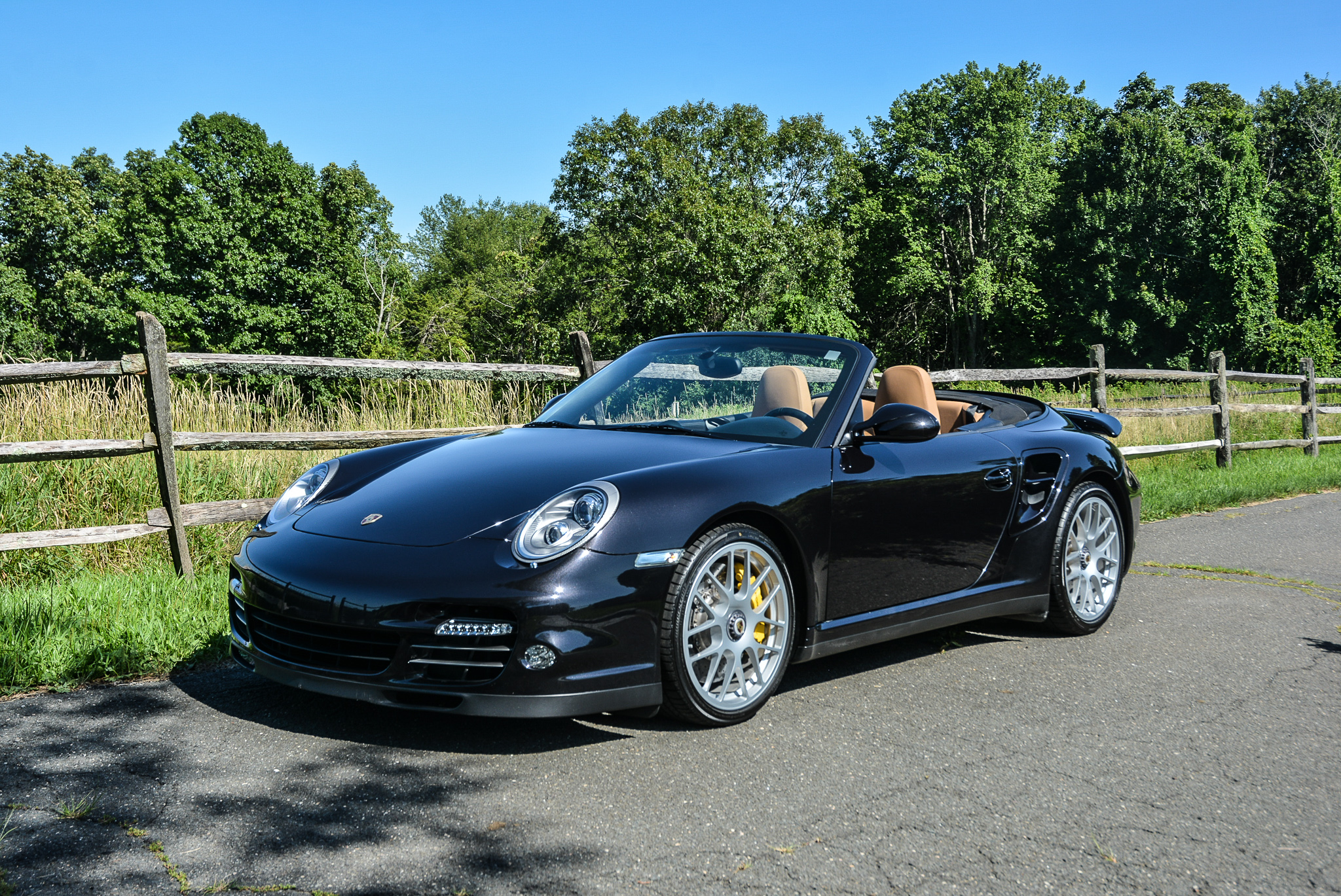 Center-lock 19″ RS Spyder wheels wear Bridgestone Potenza RE050 tires measuring 235/35 up front and 305/30 out back. Ceramic Composite Brakes (PCCB) were standard on the Turbo S and feature yellow-finished calipers.