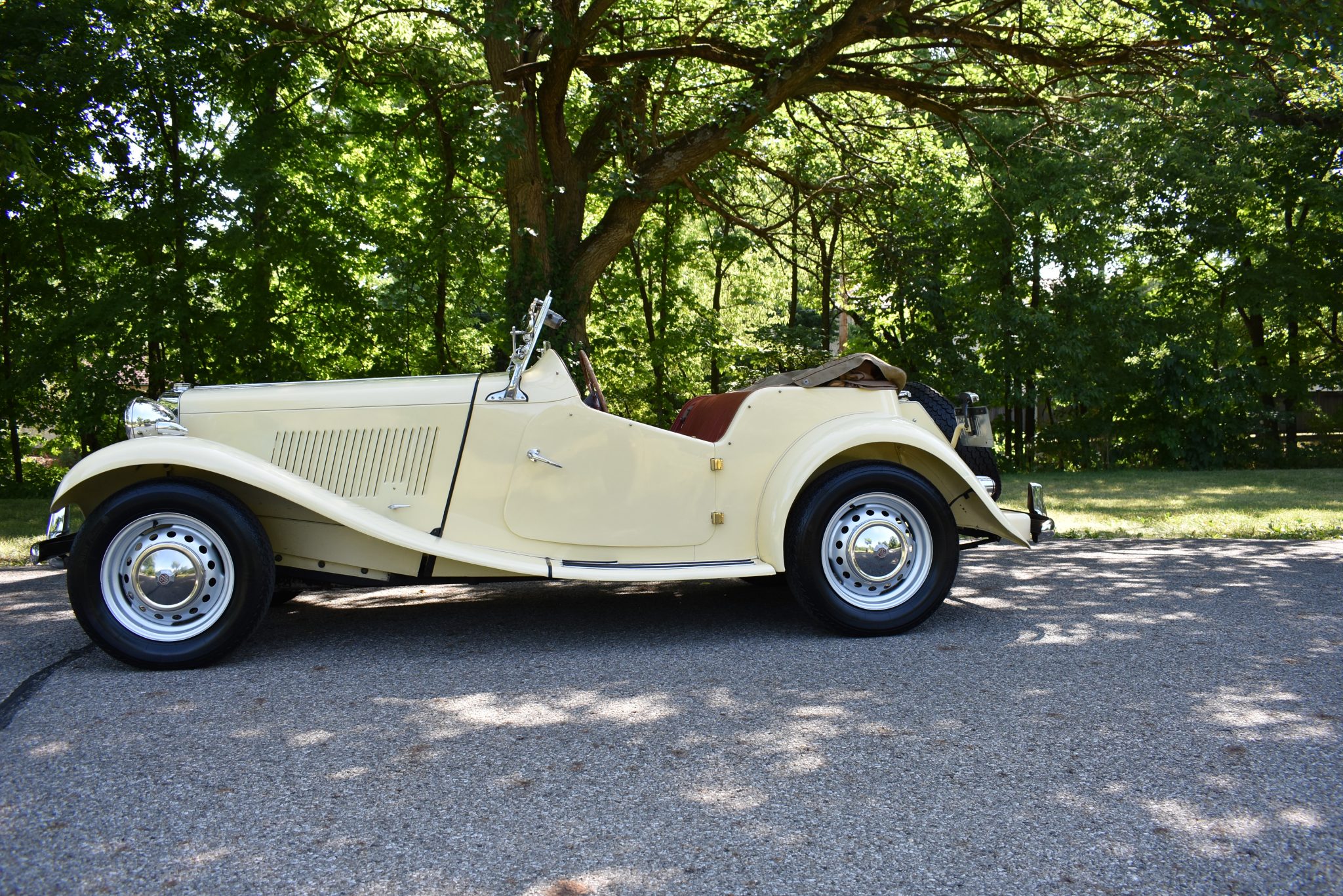 The steel wheels were refinished in silver and fitted with Vredestein Spring Classic tires in 2017. Chrome MG-branded hub caps are fitted all around, including on the rear-mounted spare.