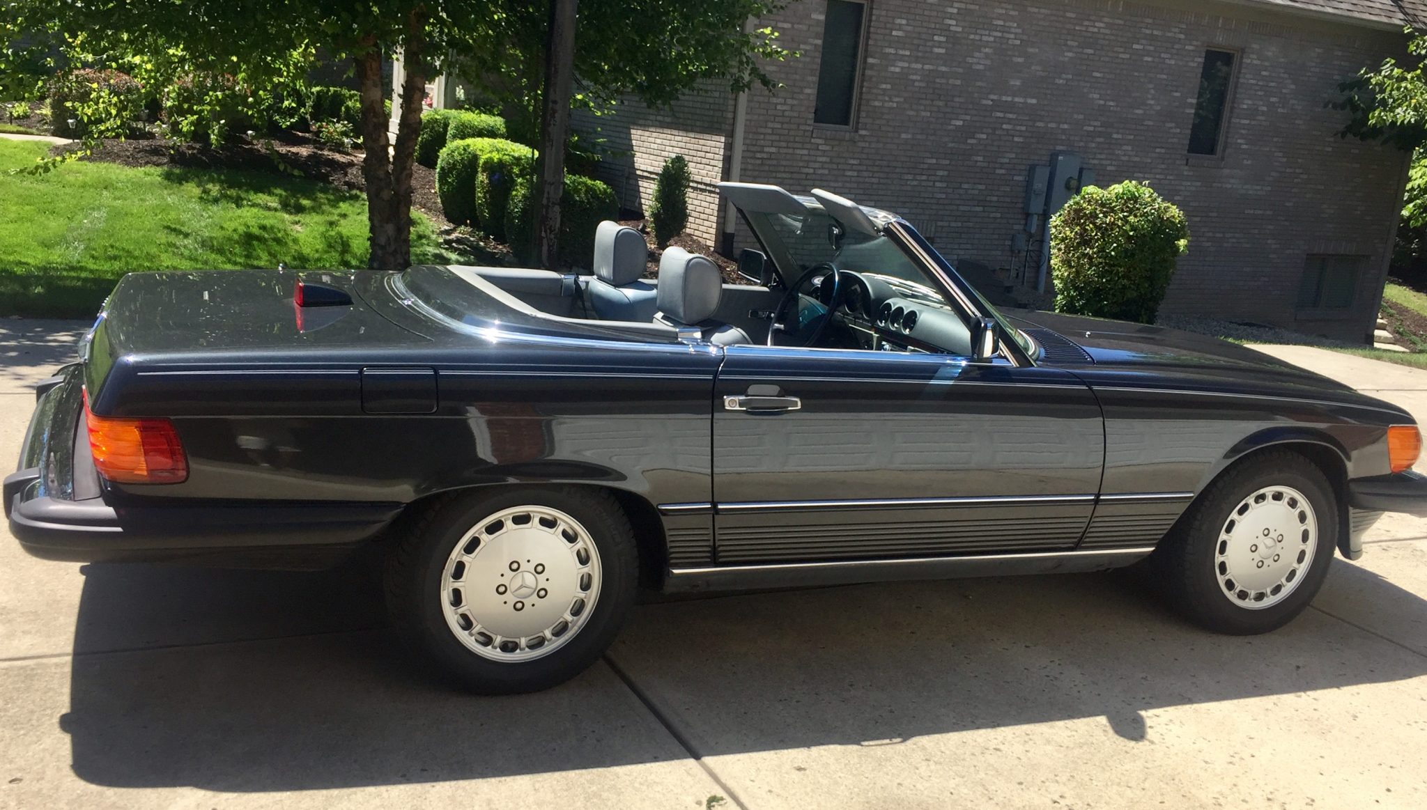 The matching factory hardtop is shown installed in the photo above. Dings are pictured in the lower body cladding and rear bumper. Stock 15” Gullideckel alloy wheels wear Michelin Hydro Edge tires.