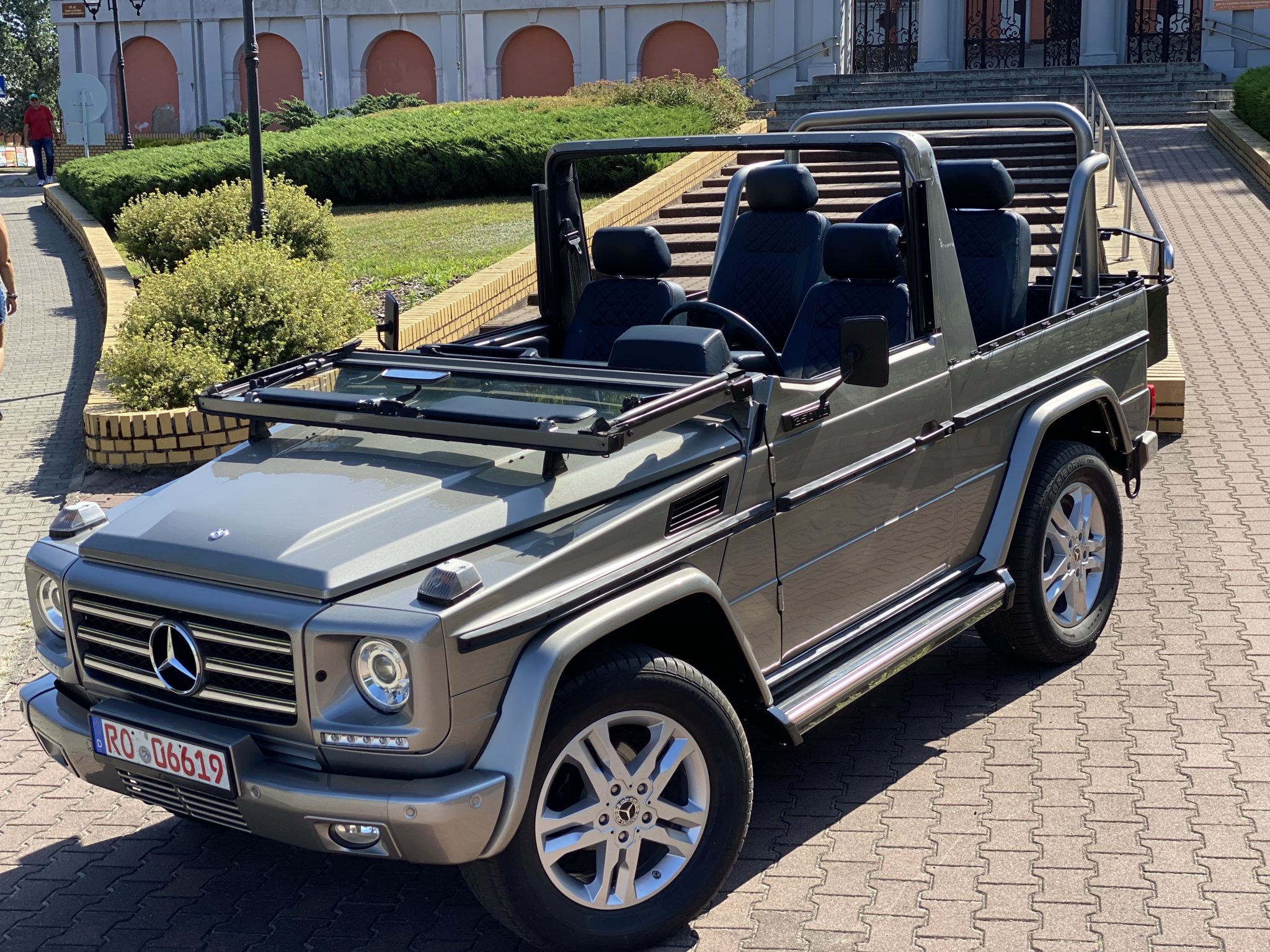 W463 G550 18″ twin five-spoke wheels are mounted on 60mm Eibach spacers and wrapped in Continental 4X4 WinterContact tires sized 265/60. A tailgate mount carries the spare wheel with a matching canvas cover. Braking is handled by front discs and rear drums.