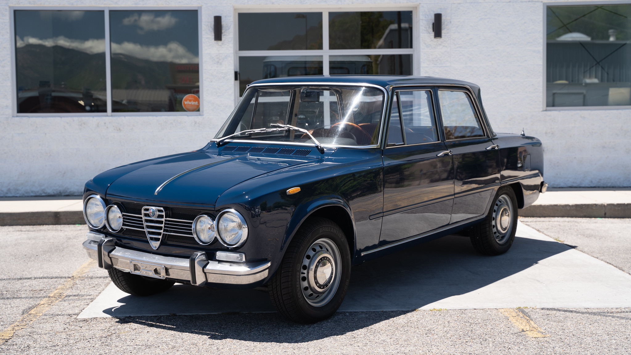Factory 14″ steel wheels wear Alfa Romeo center caps as well as Barum Brillantis 2 tires. The seller states that the brakes were serviced two years ago.