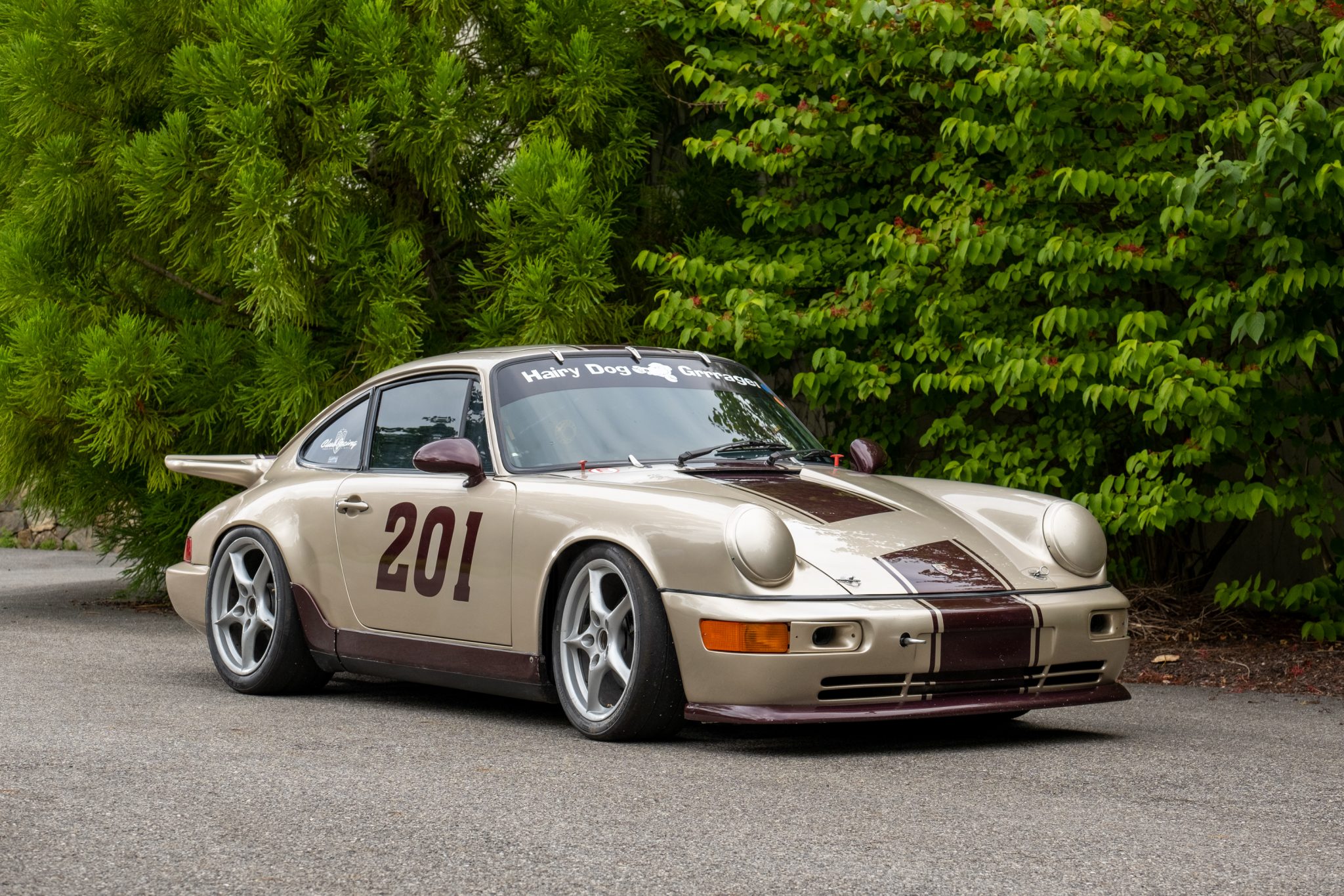 Five-spoke 18″ wheels show scuffs and are mounted with scrubbed 245/35 front and 275/35 rear Hankook Ventus C51 semi-slick tires. The seller states that Motion Control adjustable coilovers with two-way remote reservoirs have been installed. Stainless braided brake lines are utilized.