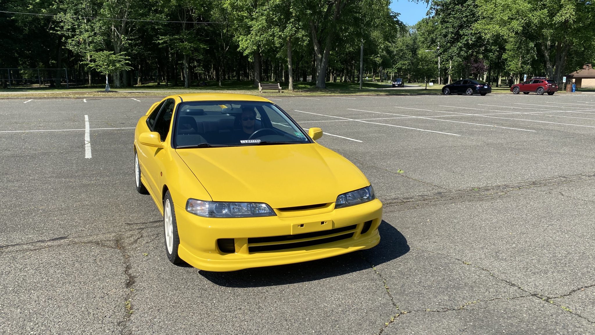 White-painted JDM-style 16″ wheels wear red Honda center caps and Westlake SP06 tires.