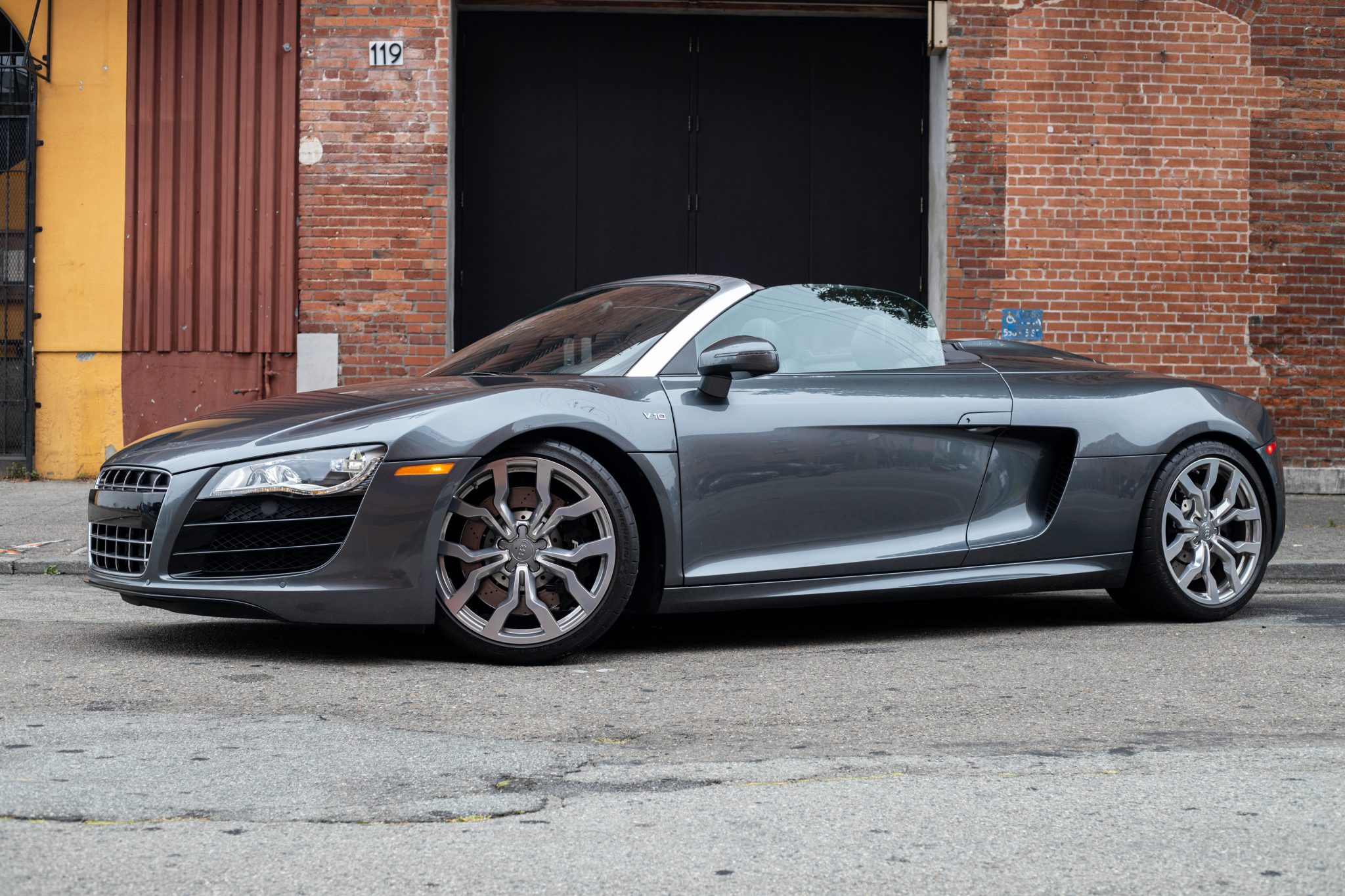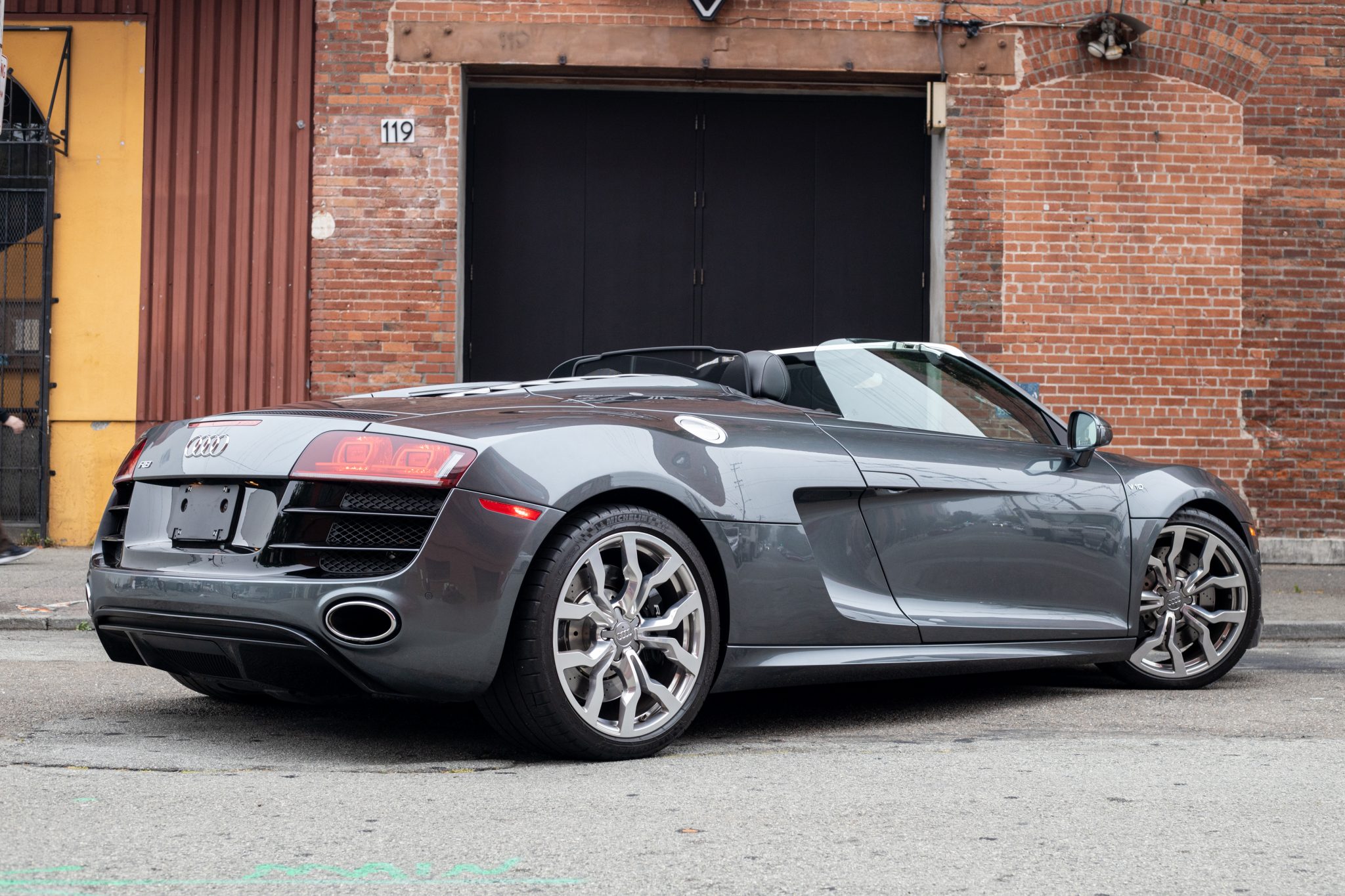 Factory 19″ forged Y-spoke wheels are mounted with 235/35 front and 305/30 rear Michelin Pilot Super Sport tires that show 2013 and 2014 date codes, respectively. The eight- and four-piston brake calipers are finished in black with white R8 script and are paired with cross-drilled rotors at each corner. The brake fluid was flushed in May 2019.