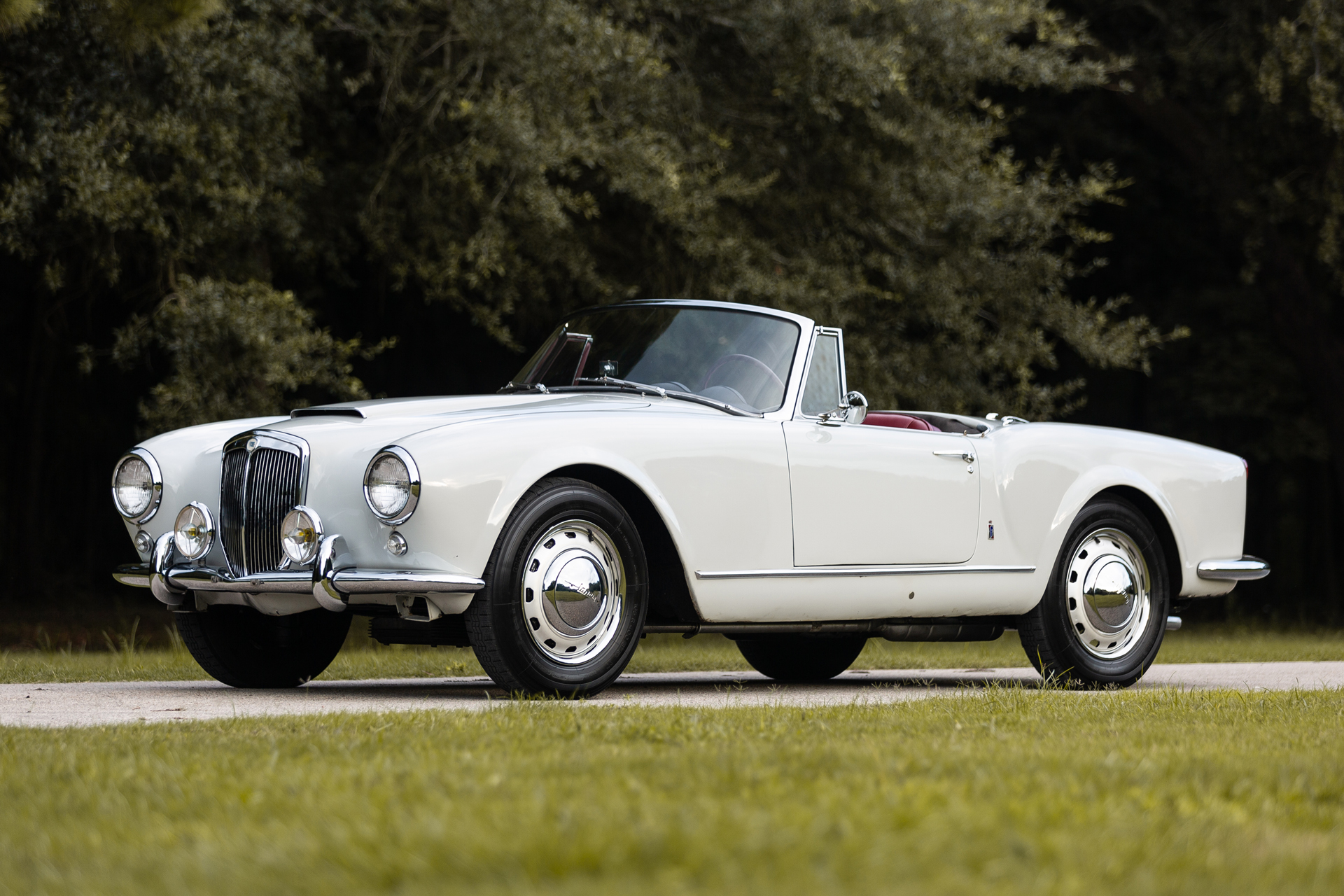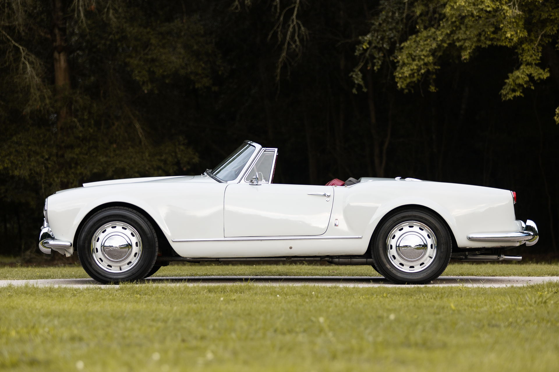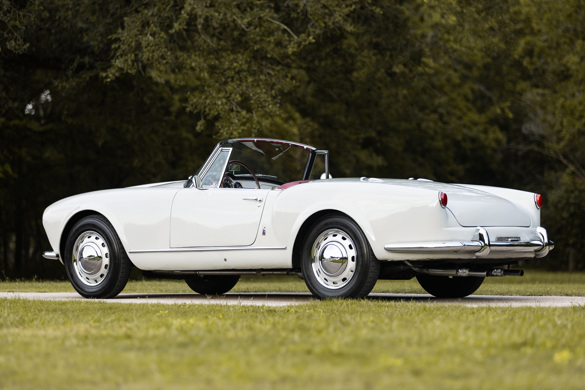 Pinin Farina bodywork wears an older repaint that is believed to have been carried out by the owner who purchased the car in 1965. According to correspondence with a family member of that owner, chassis 1445 had been repainted in a non-original color before the owner returned it to the factory shade of pale gray. Yellow Marchal driving lights were installed in 2020, and the black soft top can be seen in its raised position in the gallery below along with closeups of the finish, trim, lenses, date-coded Sekurit glass etchings, and various imperfections.