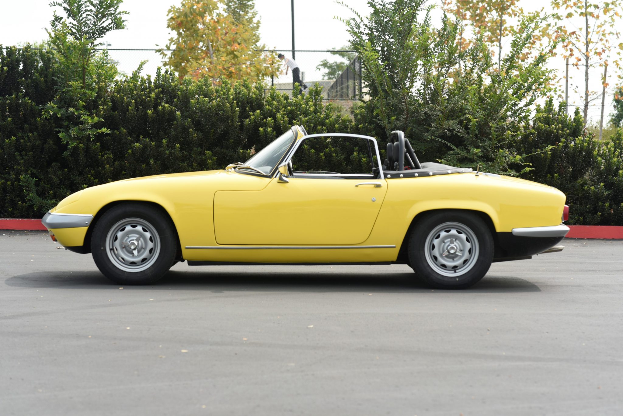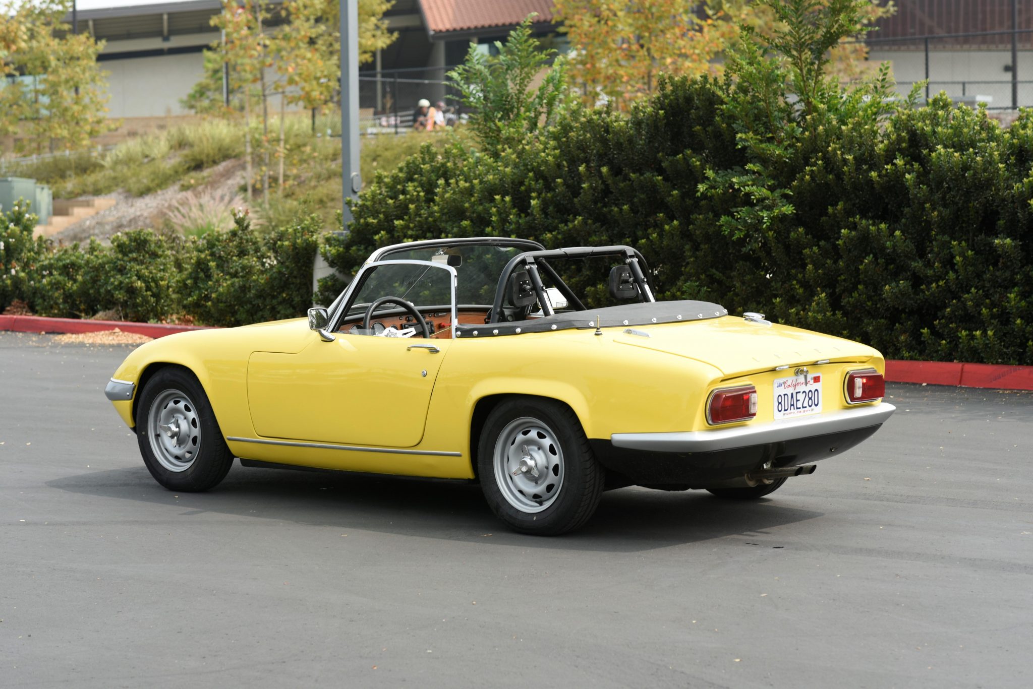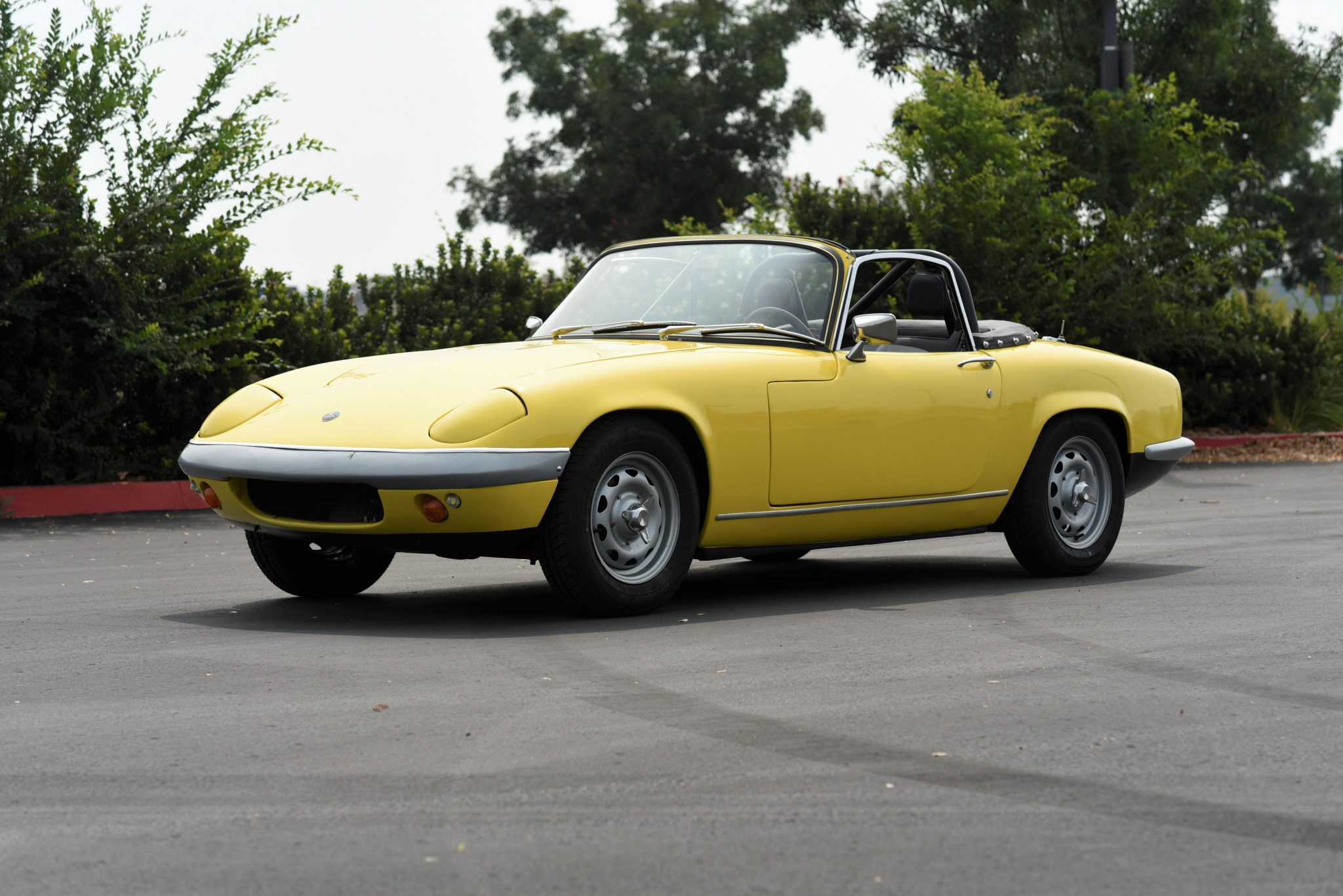 Painted 13″ steel knock-off wheels wear Dunlop Dunlop Street Response tires sized 155/80 with 2019 date codes. A dual-circuit master cylinder from Caterham actuates the four-wheel disc brakes. According to the seller, a 5/8″ anti-roll bar, front and rear wishbones, rear hub adapters, and upper control arms from Spydersport have also been fitted.
