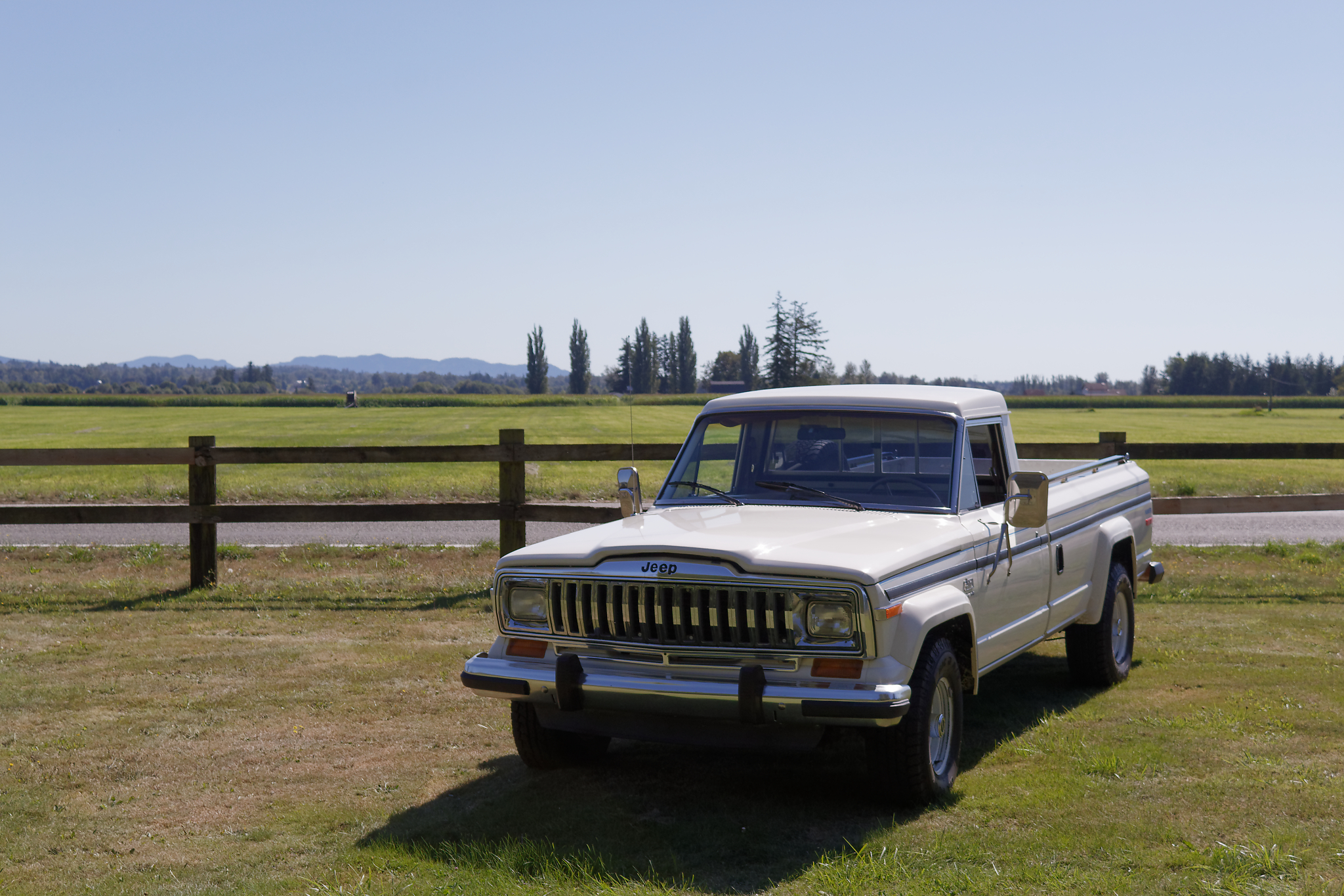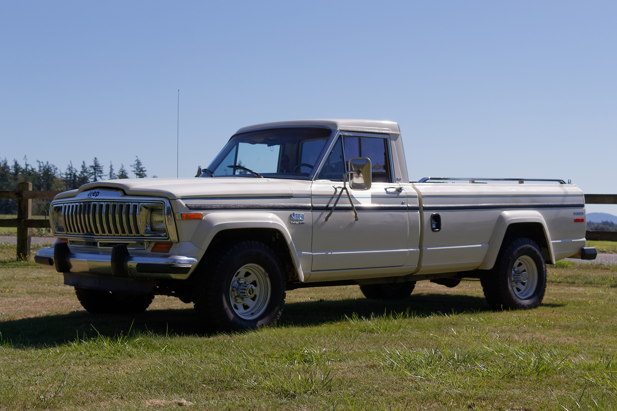 White 15″ steel wheels are mounted with Big Foot Big O A/T tires and feature lockable front hubs and Jeep-script center caps. A spare is mounted in the bed, and the seller states that the truck features J20 springs.