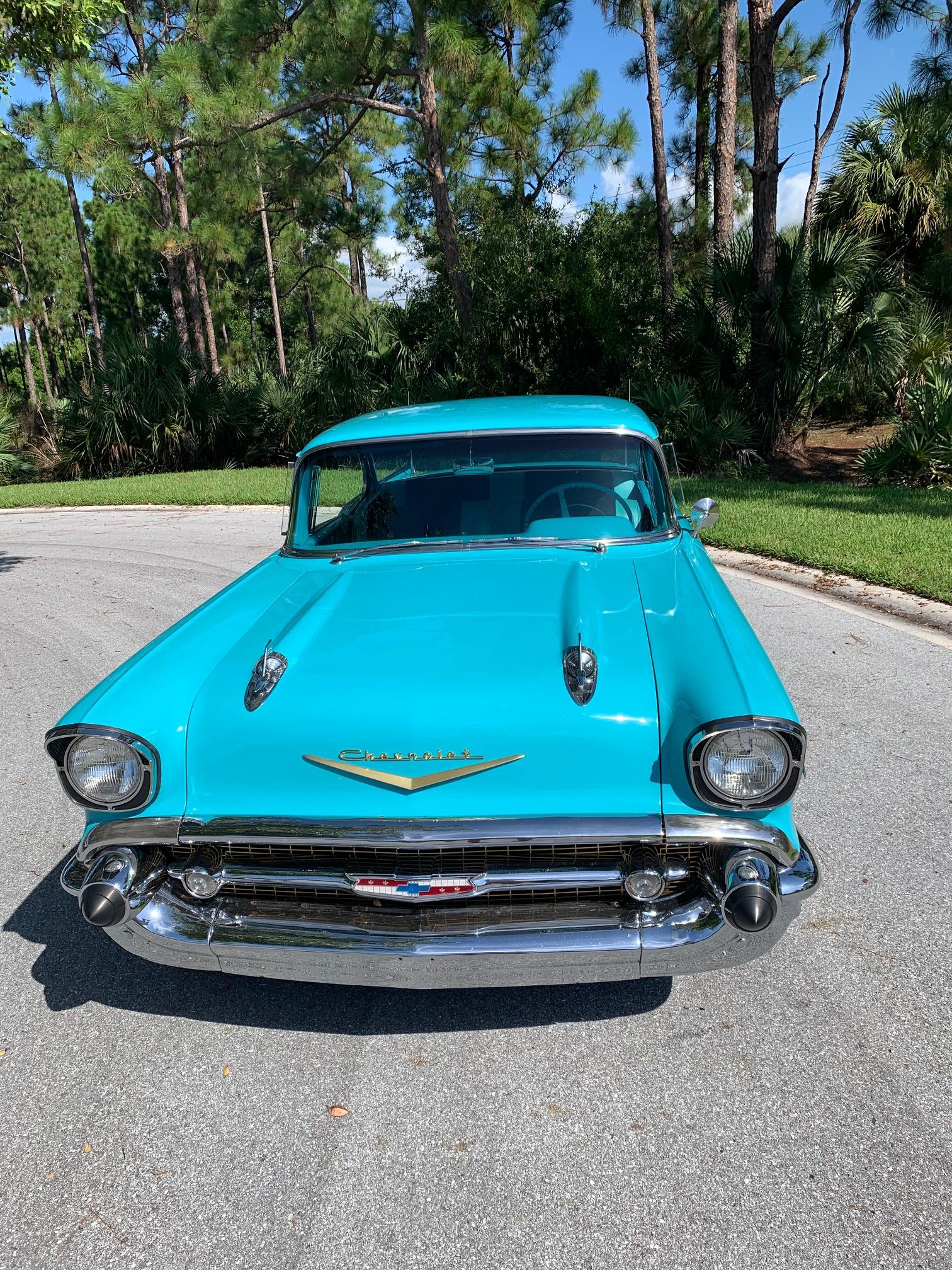 The seats are trimmed in teal vinyl with black cloth inserts, which are matched by the door and side panels. Darker carpets are protected by vinyl mats. Amenities include wing windows, a retro-style digital stereo, a heater, and a clock mounted above the glovebox, though the latter is inoperable.