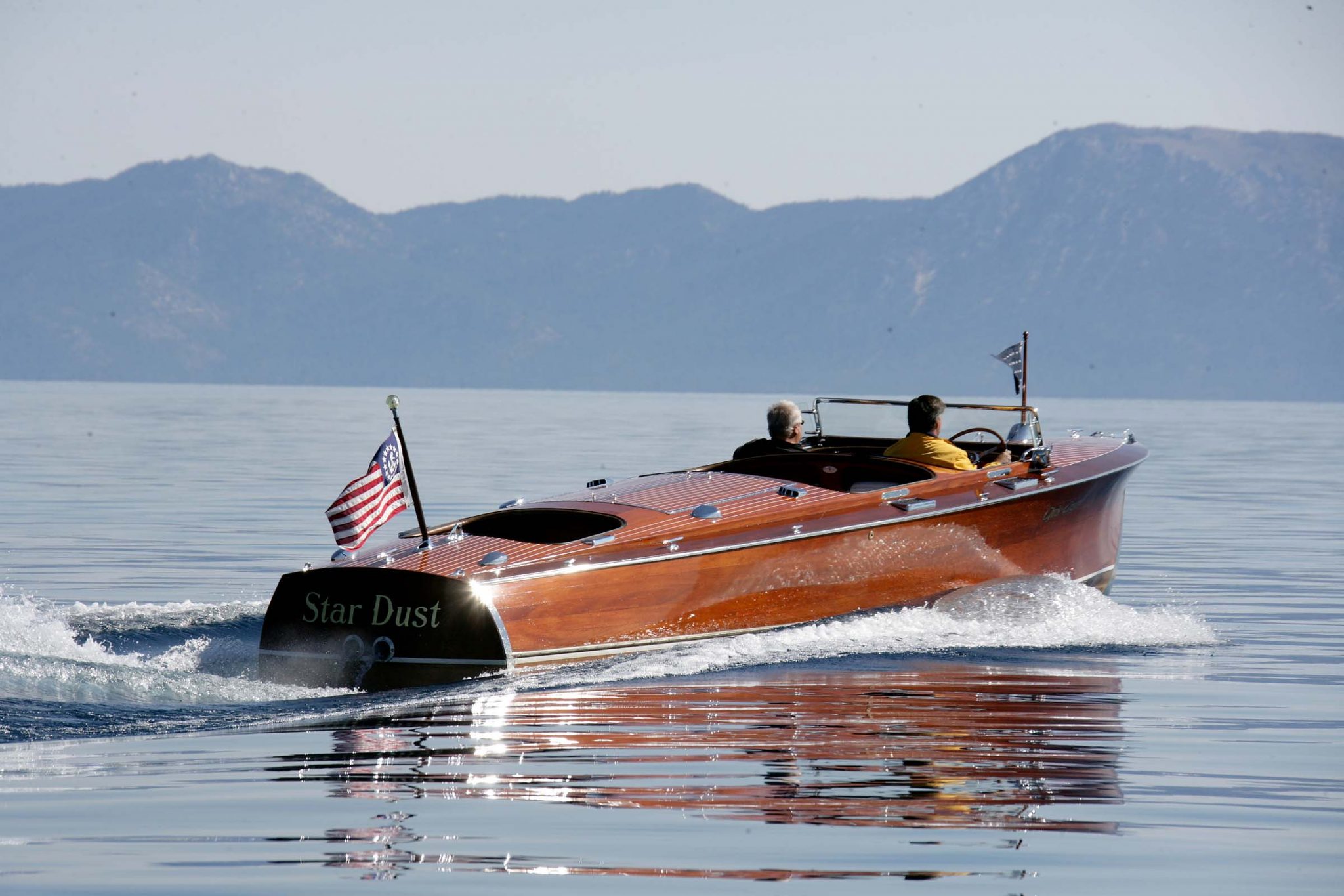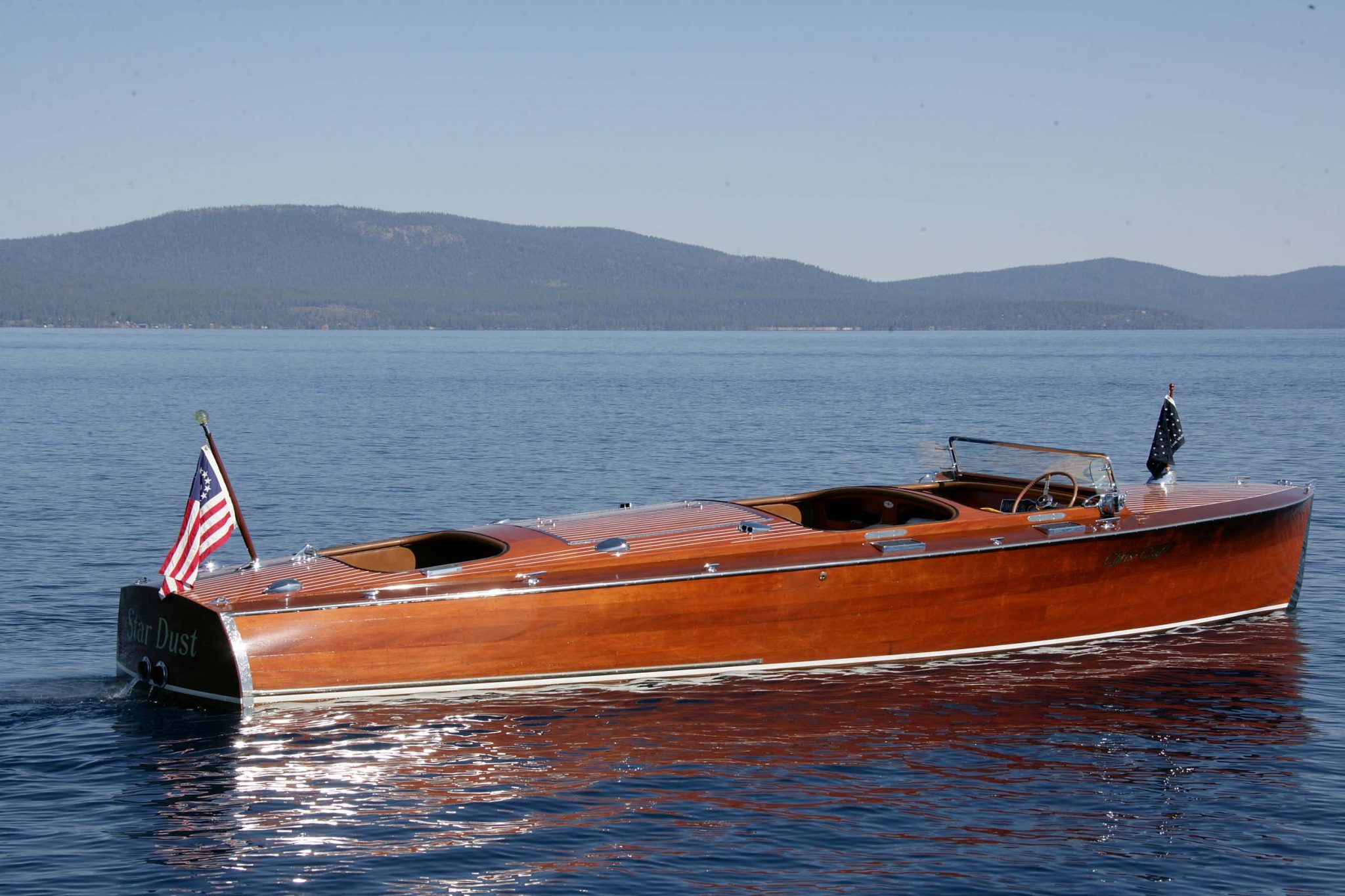 The foredeck and quarterdeck are natural varnished mahogany, and the king planks and coverboard are stained walnut. The vessel’s registration number and manufacturer’s name are painted on the sides, while its name, Star Dust, can be found on the transom. In 2003 Western Runabouts sanded, repaired, and varnished the hull and deck.