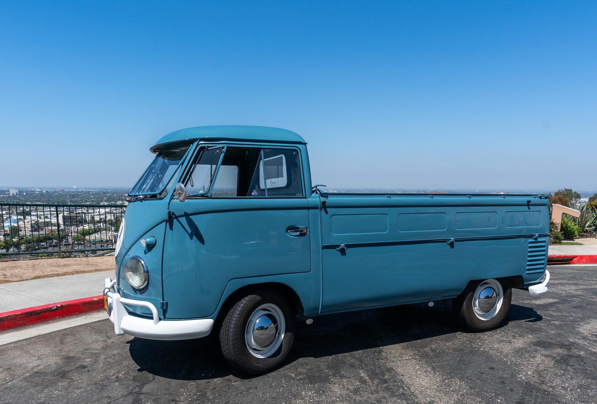 White-painted 15″ steel wheels wear chrome-finished VW hubcaps and are mounted with GT Radial Champiro VP1 tires measuring 205/75. The seller notes that Beetle headlamps are currently fitted.