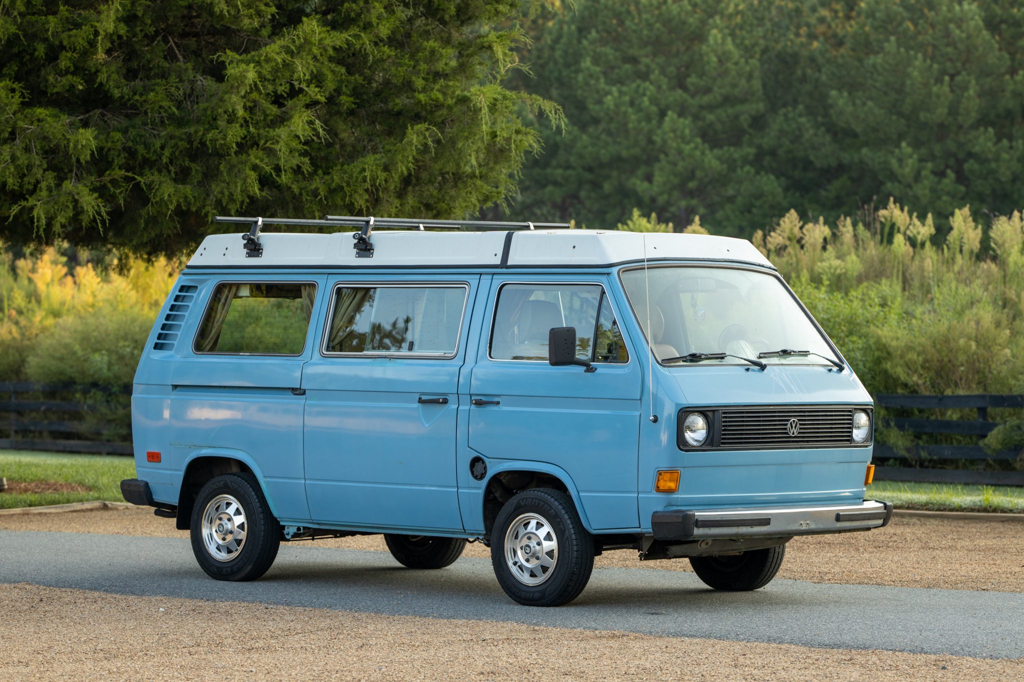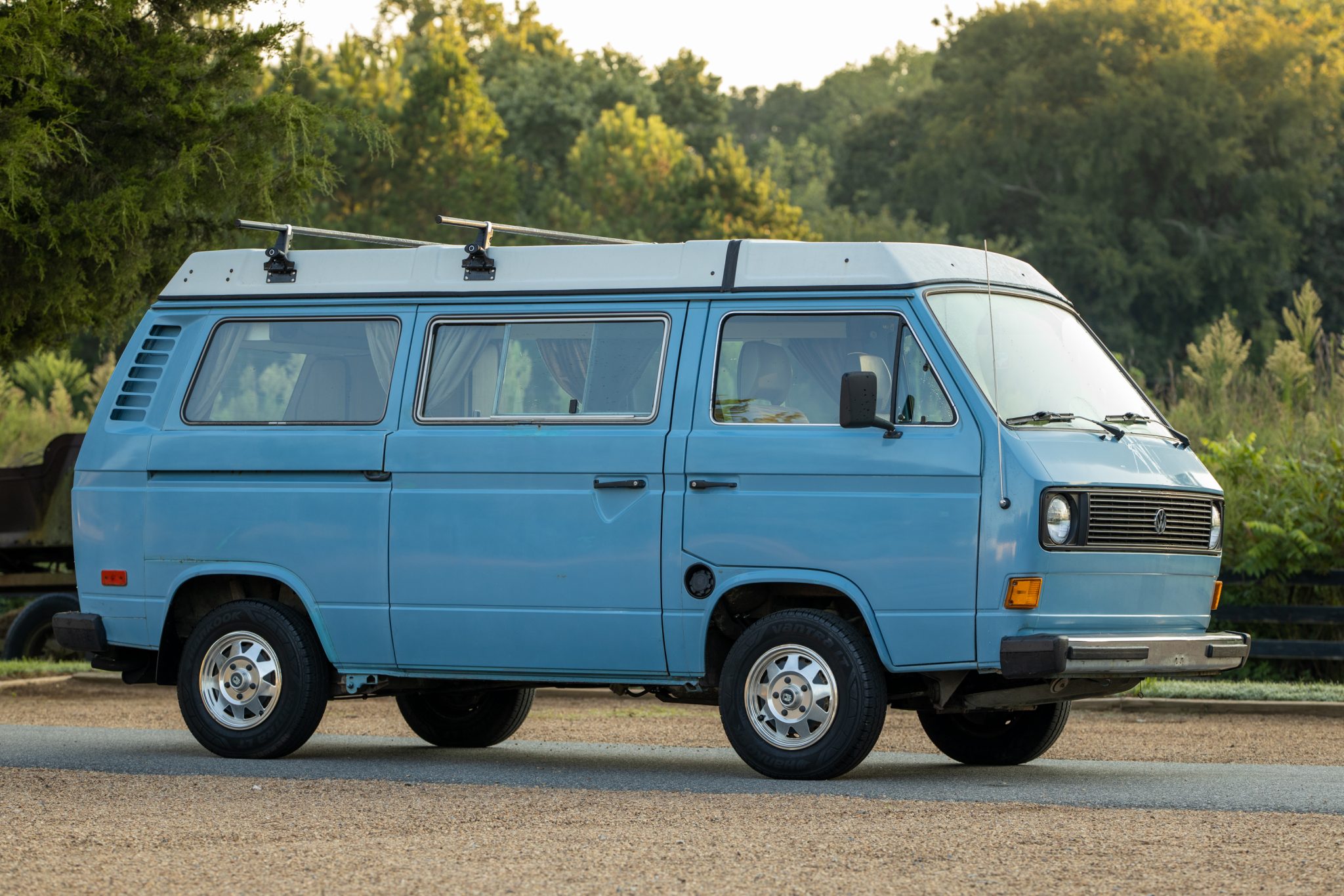 The pop-top is shown in the gallery both raised and lowered as well as from the inside, and it features replacement canvas and seals fitted during prior ownership. 14″ wheels with Wolfsburg center caps are equipped with Hankook Vantra tires said to have been fitted in 2017.