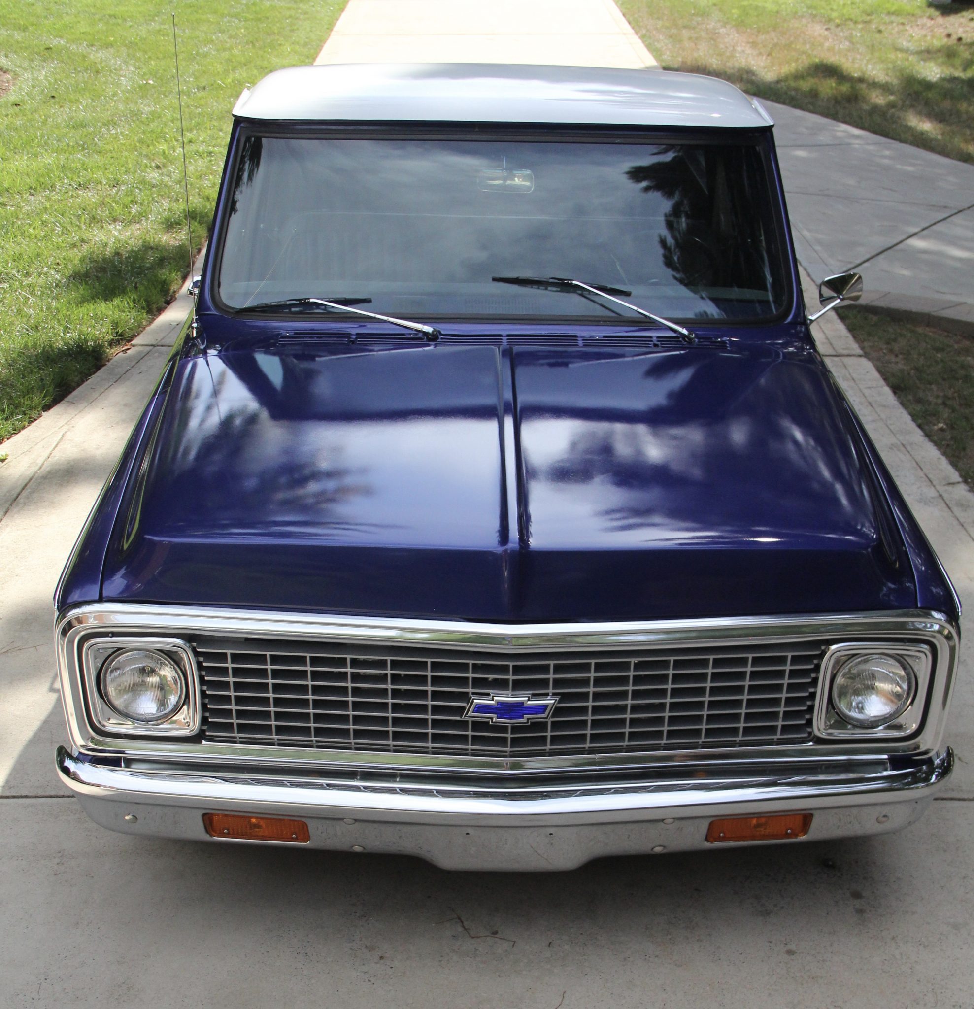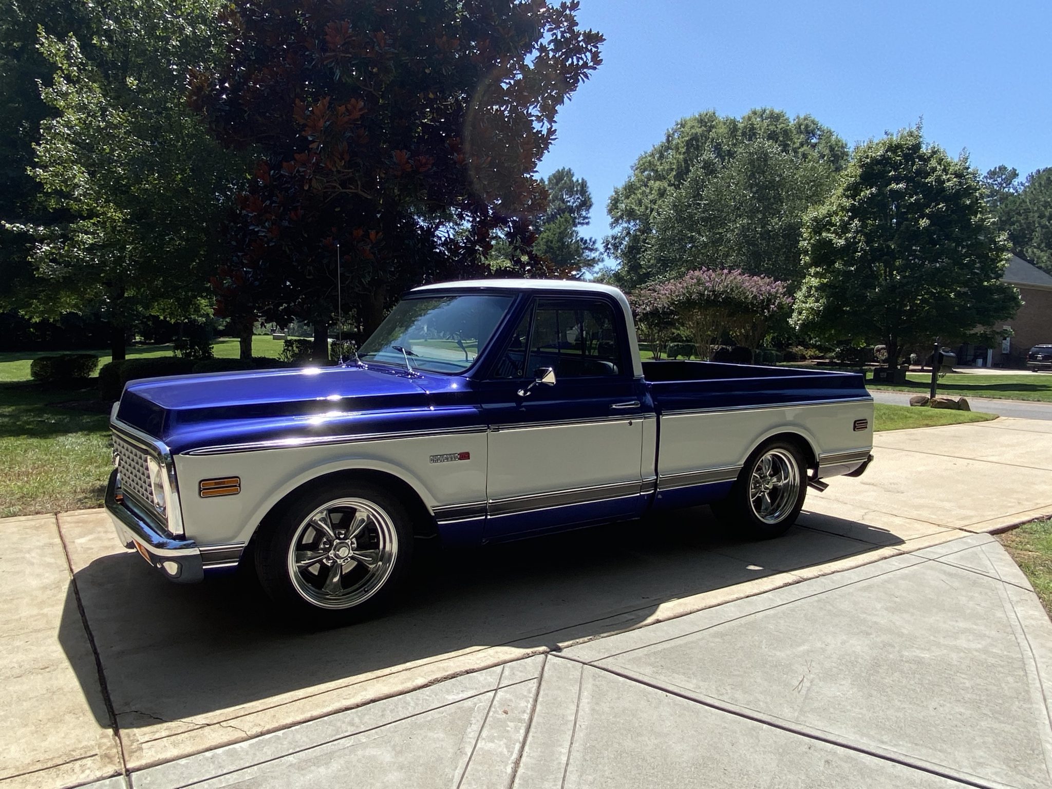 Chrome American Racing wheels are mounted with Nitto tires at each corner. The truck is equipped with power steering, and the fuel tank was relocated to the underside of the rear of the cargo bed.