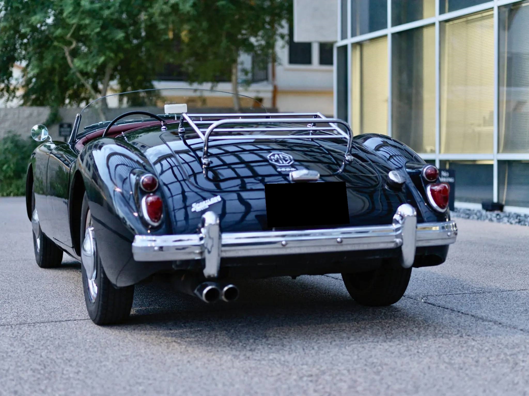 Black-painted 15″ steel wheels are fitted with polished hub covers and older 155/80 BFGoodrich Radial T/A tires. A trunk-mounted spare is fitted with a Firestone whitewall tire.