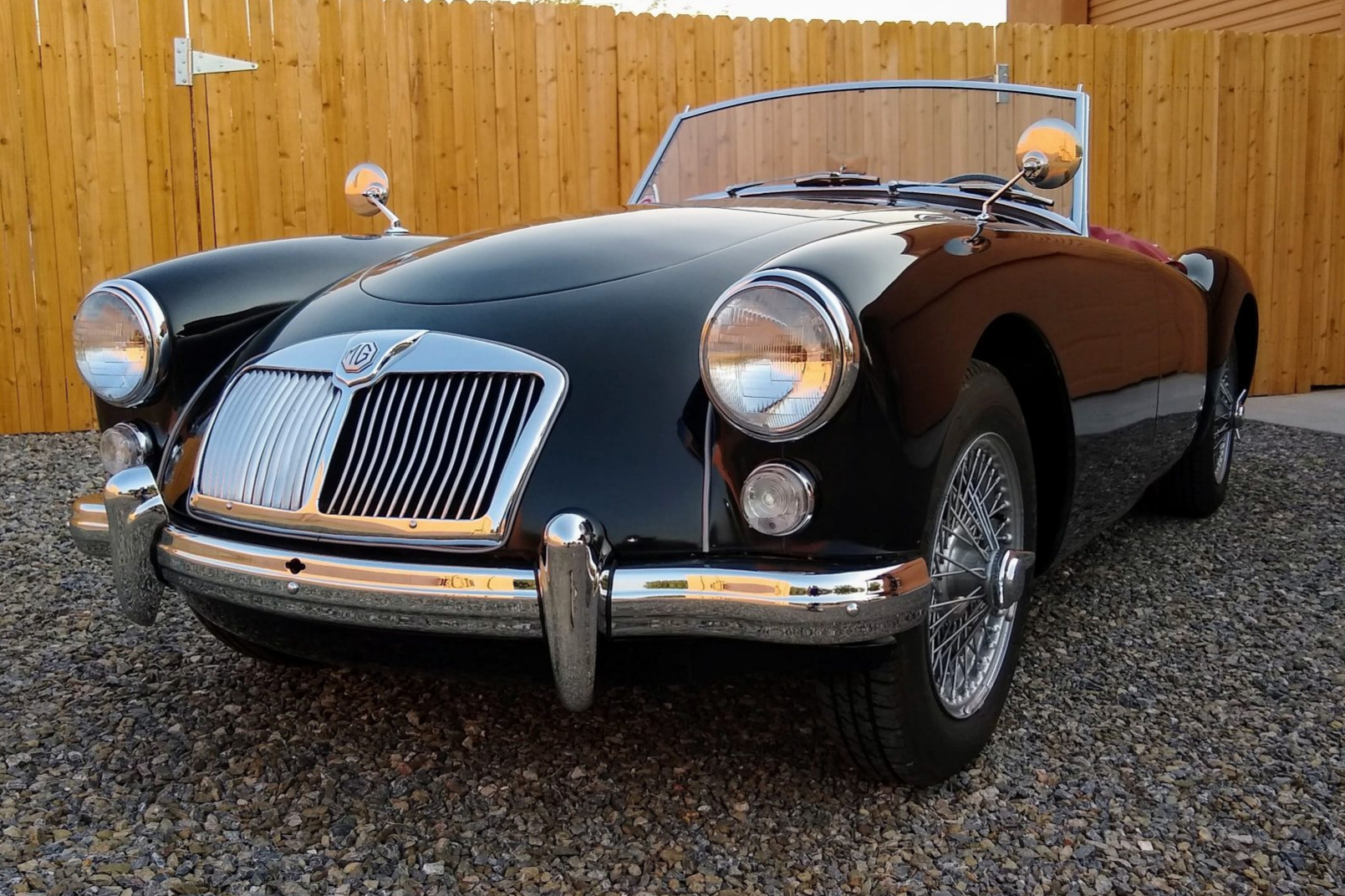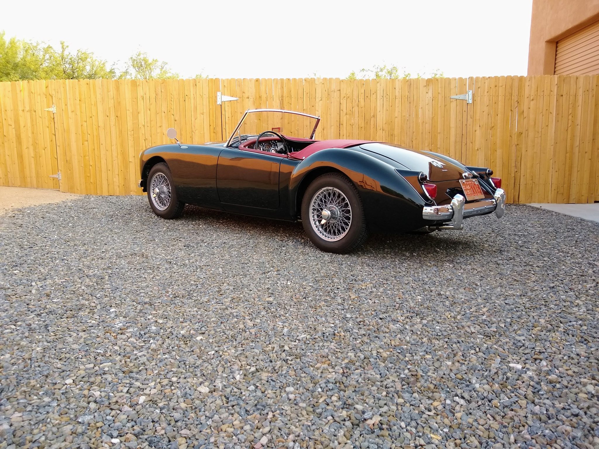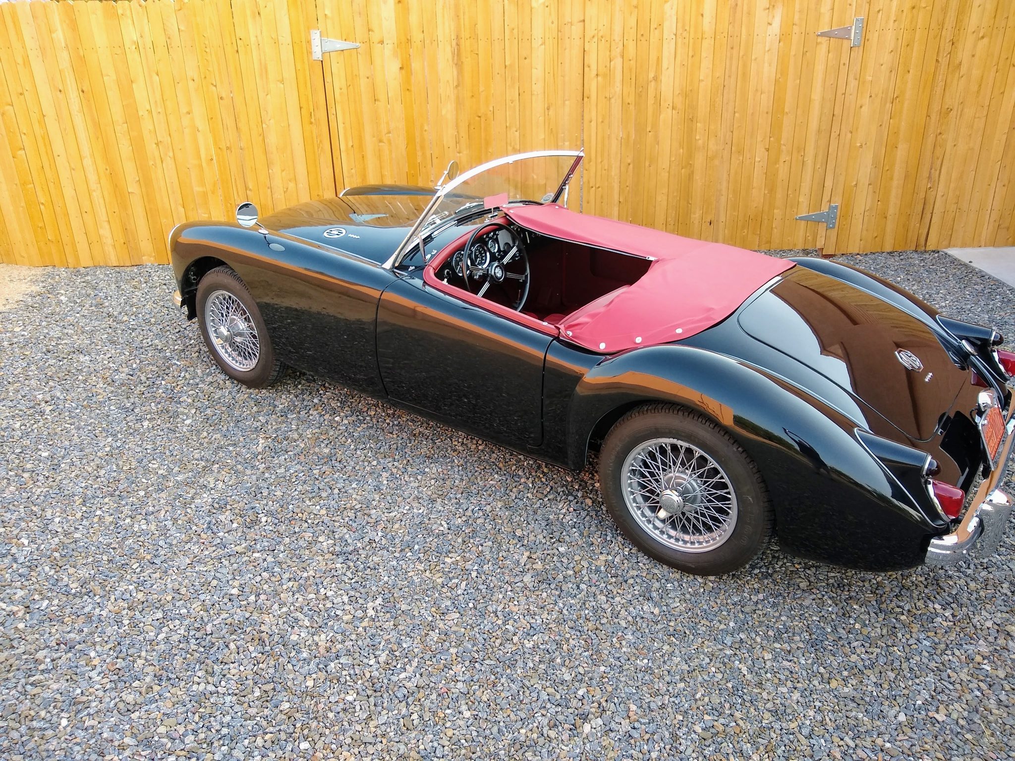 The 15″ 60-spoke knock-off wire wheels are mounted with Firestone F-560 tires. The seller reports that A-arm bushings from an MGB V8 have been added, and additional refreshment included replacing the wheel bearings as well as the brake discs, pads, lines, and master cylinder.