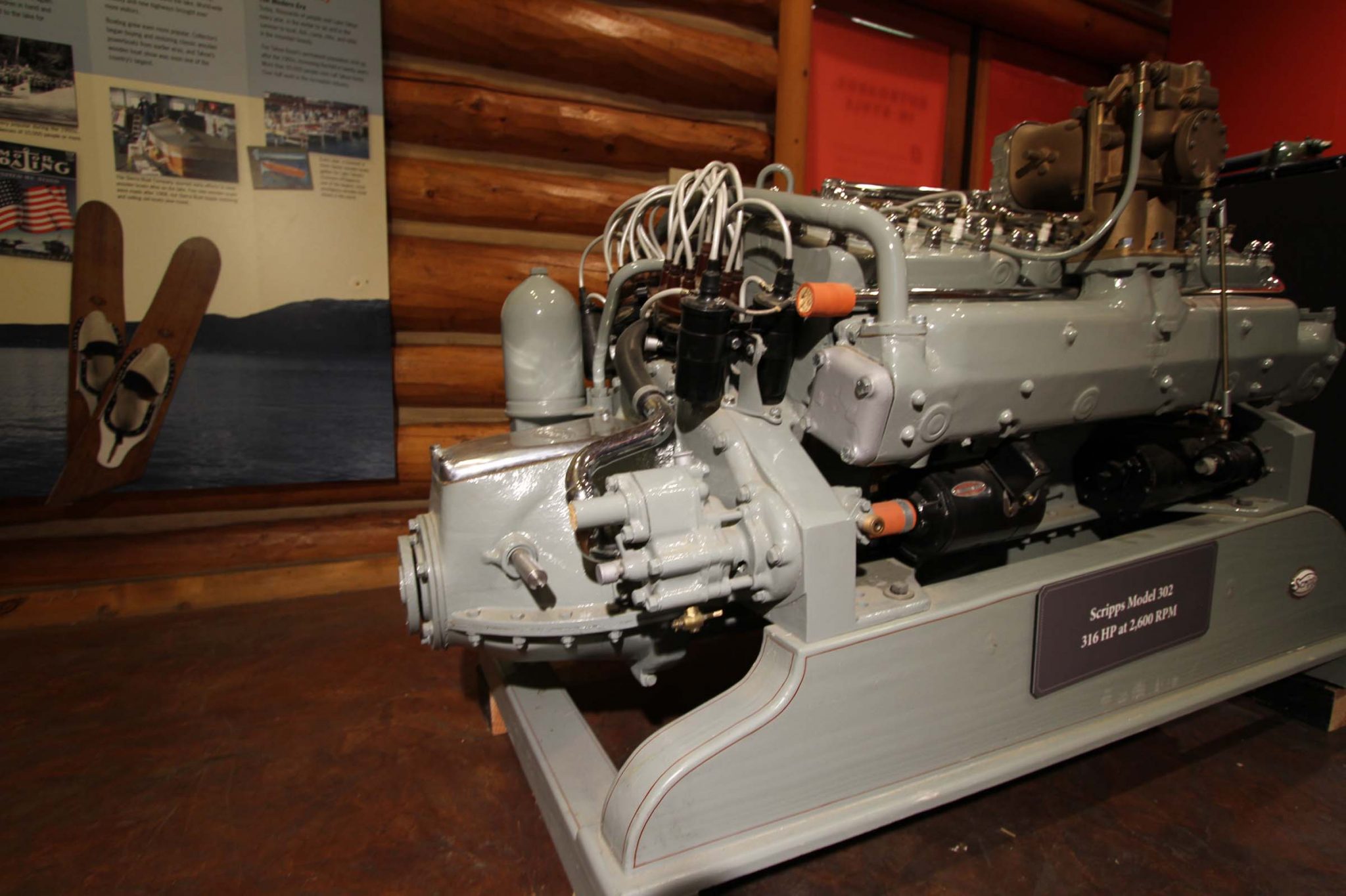 The president of the Tahoe Maritime Museum commissioned Allen Marine Engines to rebuild the V12 in 2008. The intention was to produce an exhibit that could also serve as a replacement power plant for the museum’s ride boat, a 28′ Gar Wood 28′ triple-cockpit runabout named Miss Tahoe. The restoration reportedly required 100 hours of labor and included custom machining of internal components. New cylinder heads, valves, and Babbitt bearings were also installed. A Scripps forward/reverse transmission is mated to the block, and the intake and exhaust manifolds are not operational.