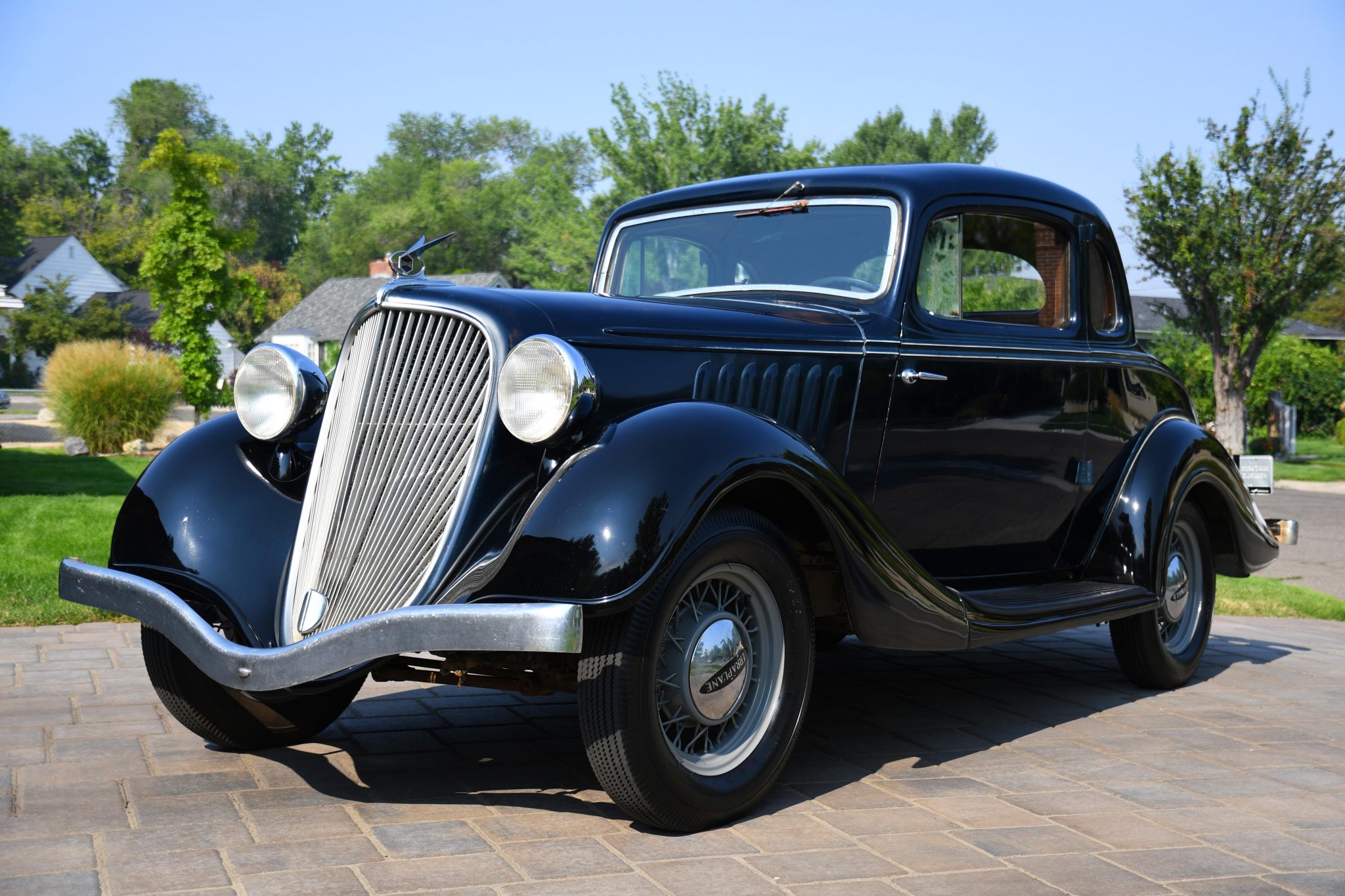 Wire wheels with a gray powdercoated finish wear Terraplane-branded hubcaps and older 17″ Coker/Firestone tires with pie-crust sidewalls, including a spare wheel housed within the lockable carrier.
