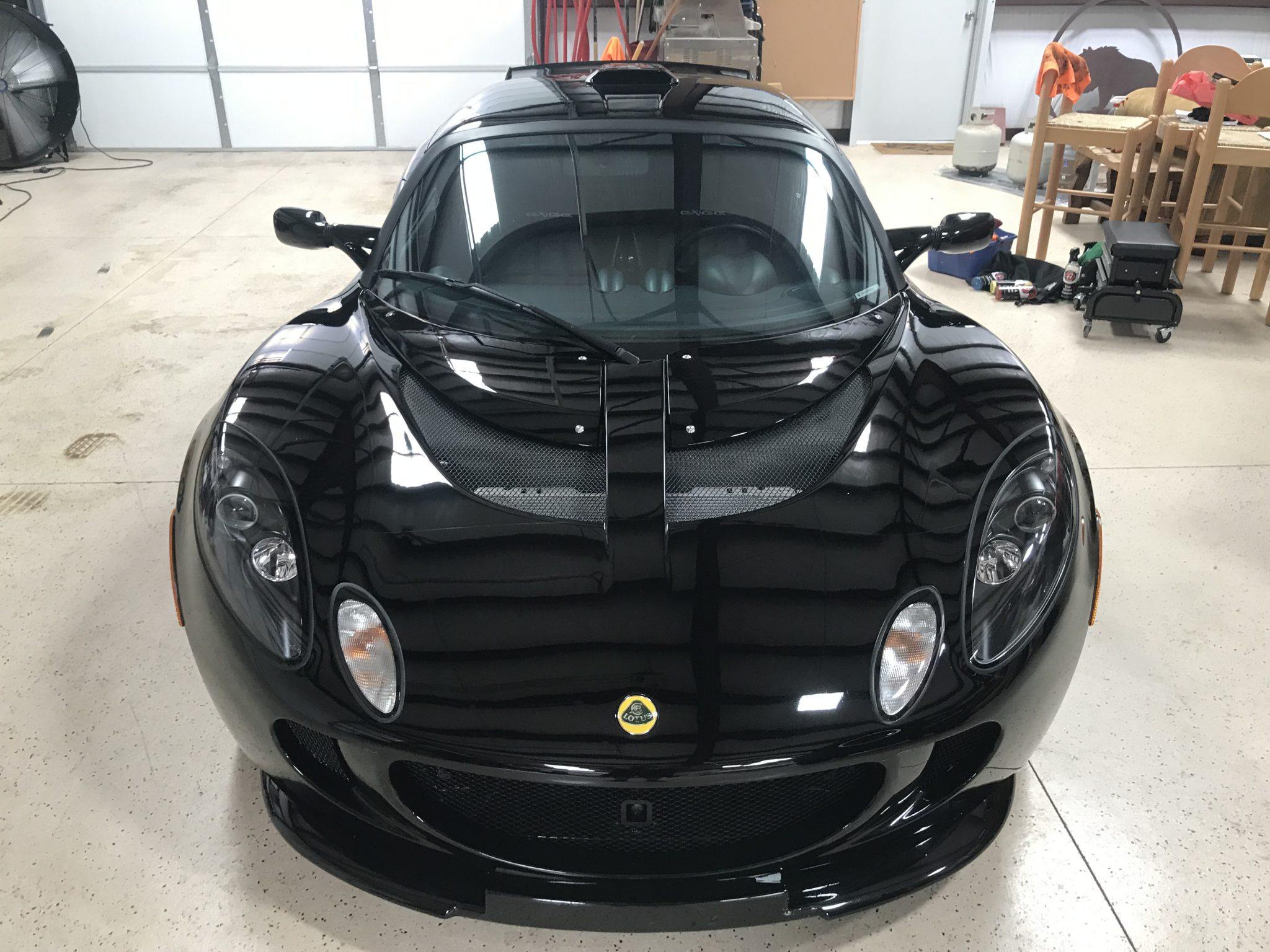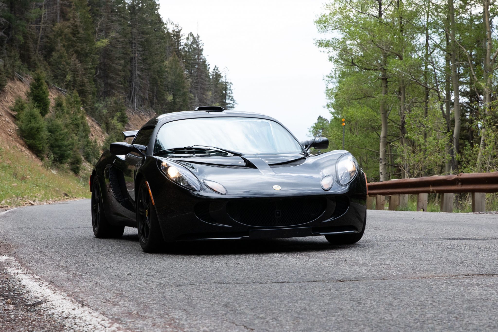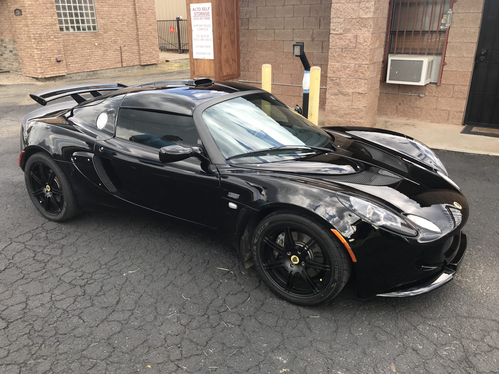 Factory paired-spoke forged wheels are finished in black and measure 16″ up front and 17″ out back, and are mounted with Bridgestone Potenza RE17R tires. Curb marks are shown up close in the gallery below. The Exige is equipped with stiffer Eibach spring and Bilstein dampers than the contemporary Elise, and braking is handled by cross-drilled and vented rotors at all corners.